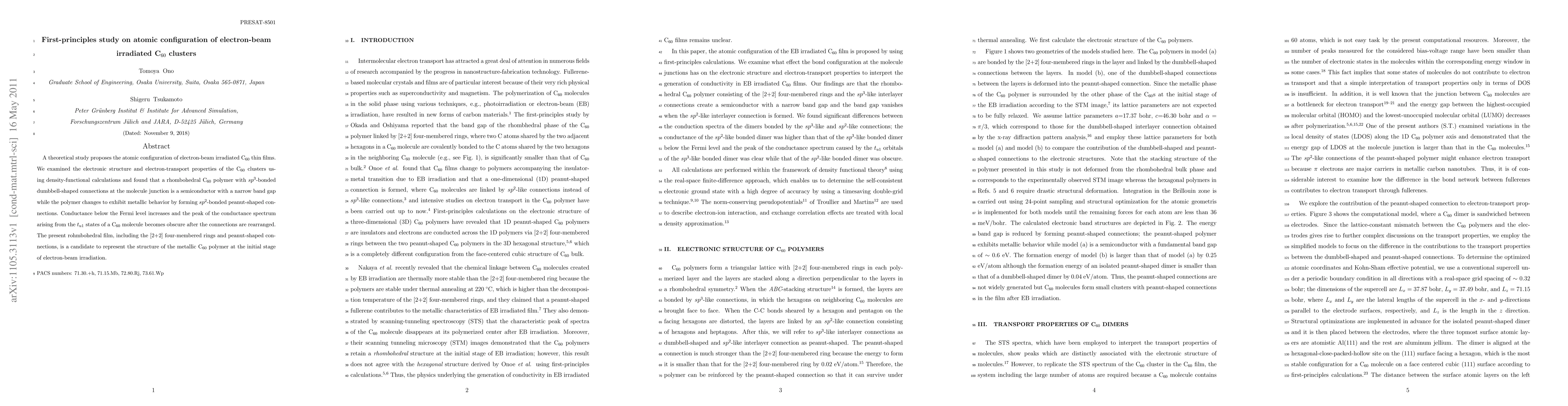 Researchers studied the atomic configuration of C60 clusters after electron-beam irradiation, finding that it changes from a semiconductor to metallic behavior with specific bond rearrangements.