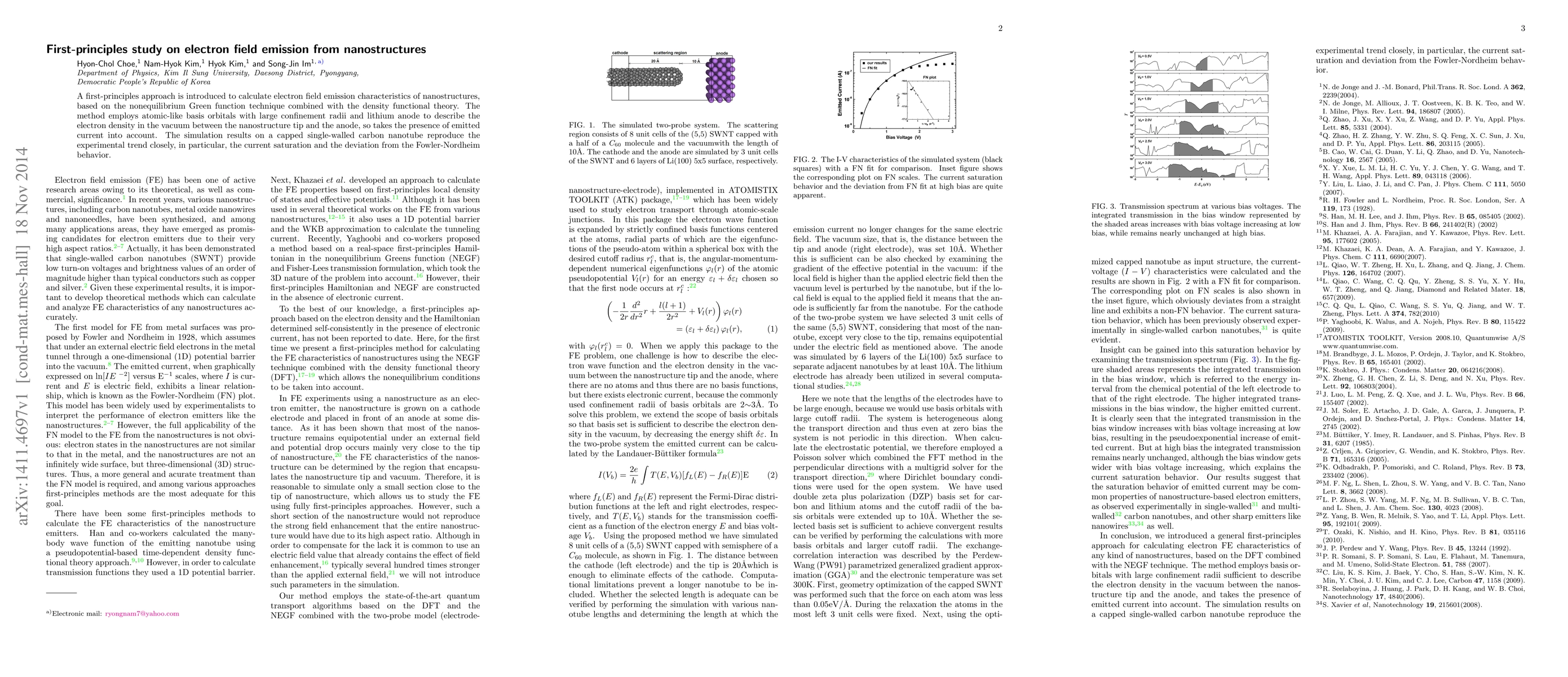 This paper employs first-principles calculations using nonequilibrium Green's functions and density functional theory to study electron field emission from nanostructures, specifically a capped single-walled carbon nanotube. The method accurately reproduces experimental trends, including current saturation and deviations from Fowler-Nordheim behavior.
