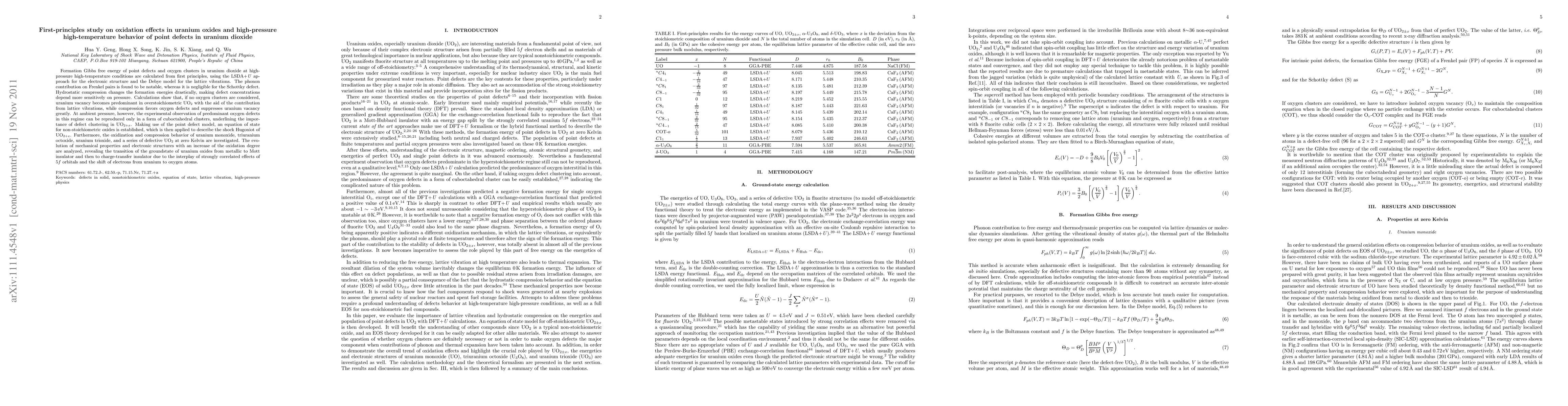 This study employs first-principles calculations to investigate the formation energies of point defects and oxygen clusters in uranium dioxide under high-pressure, high-temperature conditions, revealing significant phonon contributions to Frenkel pairs. The research highlights how hydrostatic compression impacts defect concentrations and establishes an equation of state for non-stoichiometric oxides, elucidating the transition of uranium oxides from metallic to insulating states with increasing oxidation.