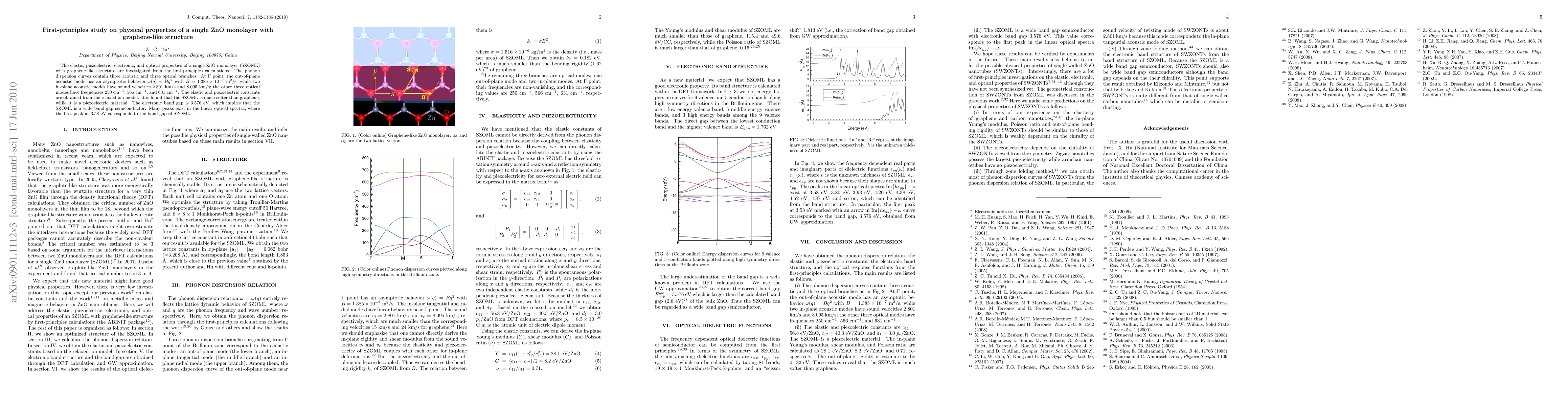 This study investigates the physical properties of a single ZnO monolayer with a graphene-like structure using first-principles calculations, revealing it to be a soft, piezoelectric wide-band gap semiconductor with an electronic band gap of 3.576 eV and distinct optical absorption peaks.