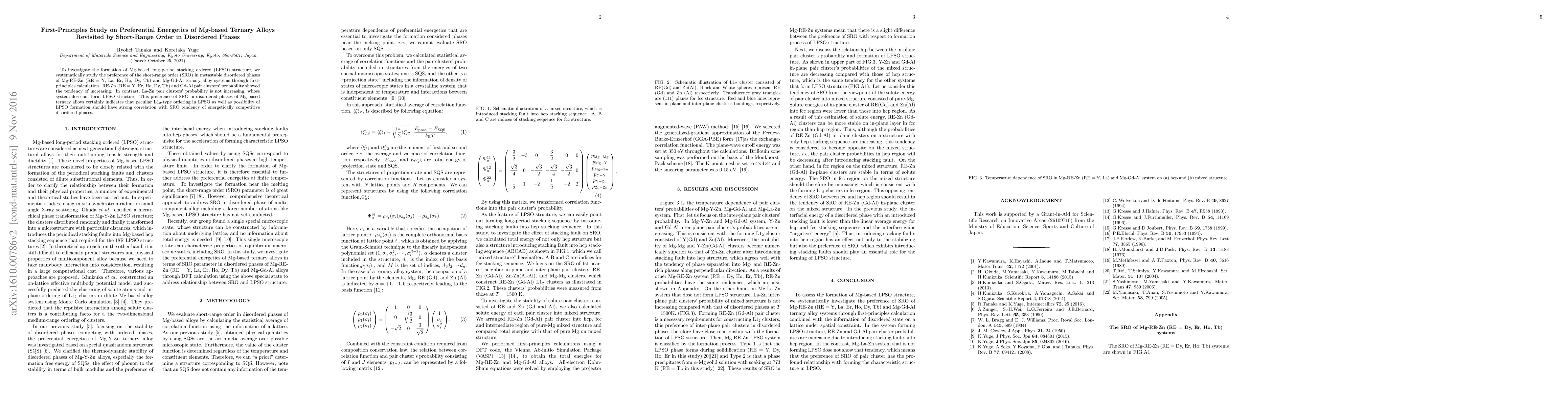 To investigate the formation of Mg-based long-period stacking ordered (LPSO) structure, we systematically study the preference of the short-range order (SRO) in metastable disordered phases of Mg-RE-Zn (RE = Y, La, Er, Ho, Dy, Tb) and Mg-Gd-Al ternary alloy systems through first-principles calculation. RE-Zn (RE = Y, Er, Ho, Dy, Tb) and Gd-Al pair clusters' probability showed the tendency of increasing. In contrast, La-Zn pair clusters' probability is not increasing, whose system dose not form LPSO structure. This preference of SRO in disordered phases of Mg-based ternary alloys certainly indicates that peculiar L12-type ordering in LPSO as well as possibility of LPSO formation should have strong correlation with SRO tendency of energetically competitive disordered phases.