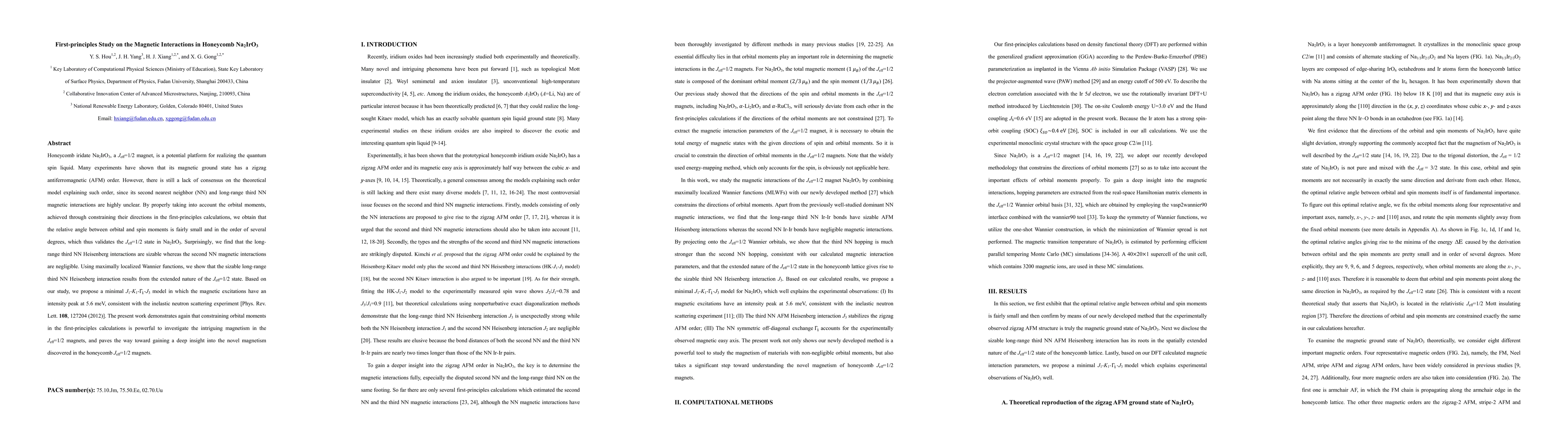 The research utilizes first-principles calculations to clarify magnetic interactions in Na2IrO3, a honeycomb iridate. It finds that long-range third nearest-neighbor (NN) Heisenberg interactions are significant, while second NN interactions are negligible, validating the Jeff=1/2 state. The study proposes a minimal magnetic model explaining observed excitations, emphasizing the importance of constraining orbital moments in first-principles investigations of Jeff=1/2 magnets.