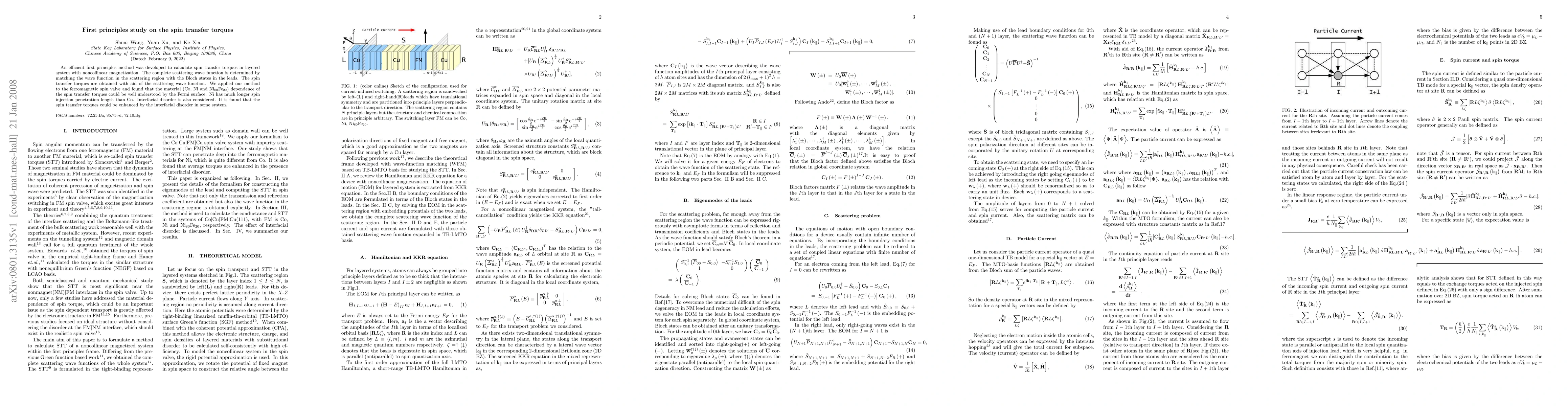 The paper presents a first principles method to calculate spin transfer torques in layered systems with noncollinear magnetization, revealing Co, Ni, and Ni80Fe20 material dependencies and the impact of interfacial disorder, showing that Ni has a longer spin injection penetration length than Co and that disorder can enhance spin transfer torques in some systems.