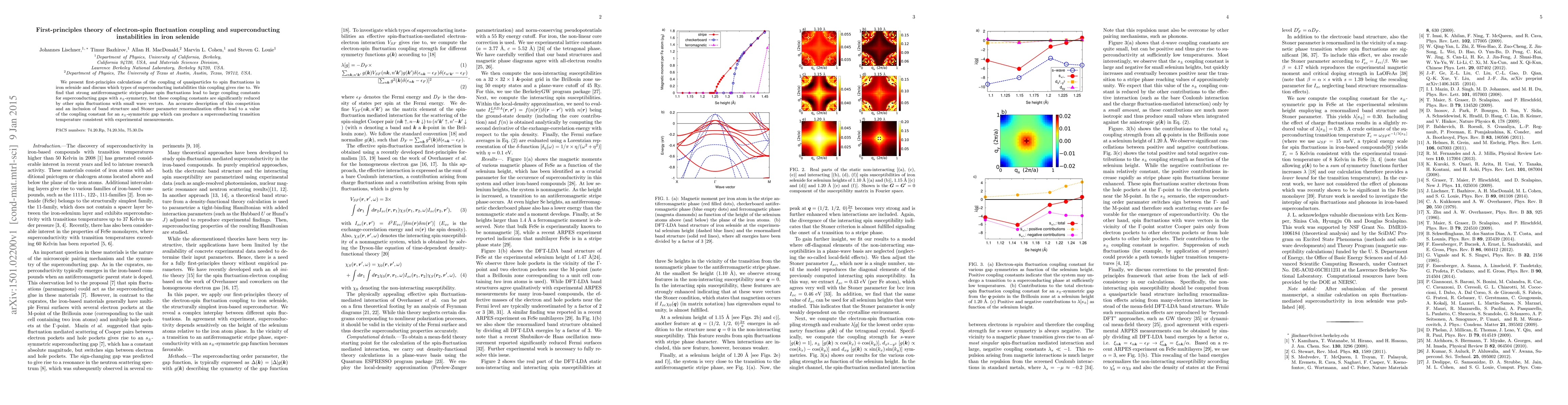 We present first-principles calculations of the coupling of quasiparticles to spin fluctuations in iron selenide and discuss which types of superconducting instabilities this coupling gives rise to. We find that strong antiferromagnetic stripe-phase spin fluctuations lead to large coupling constants for superconducting gaps with $s_\pm$-symmetry, but these coupling constants are significantly reduced by other spin fluctuations with small wave vectors. An accurate description of this competition and an inclusion of band structure and Stoner parameter renormalization effects lead to a value of the coupling constant for an $s_\pm$-symmetric gap which can produce a superconducting transition temperature consistent with experimental measurements.