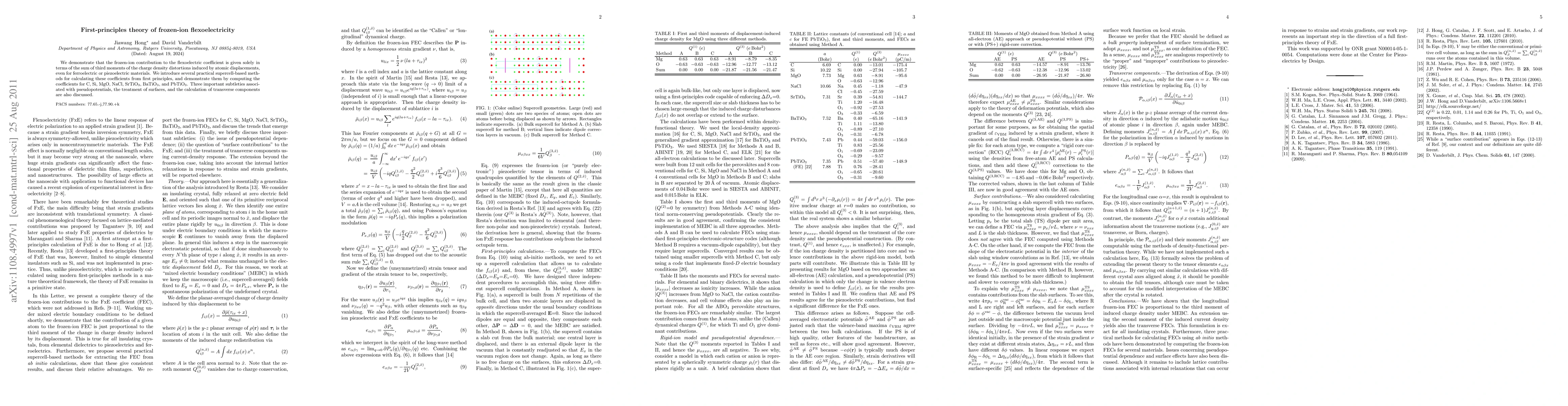 This paper presents a first-principles theory for the flexoelectric effect due to frozen ions, showing that the flexoelectric coefficient depends on the sum of third moments of charge density distortions from atomic displacements. It also introduces practical supercell-based methods for calculating these coefficients and applies them to various materials, addressing issues related to pseudopotentials, surface treatment, and transverse components.