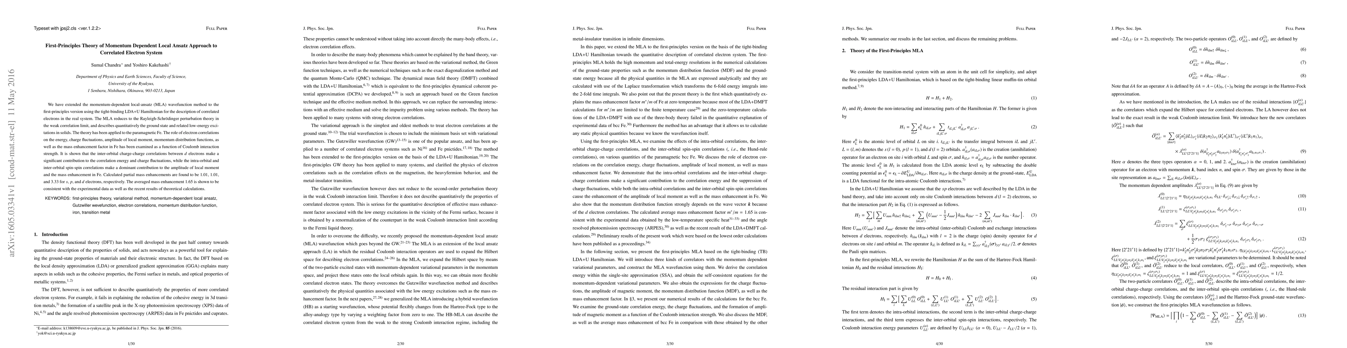 We have extended the momentum-dependent local-ansatz (MLA) wavefunction method to the first-principles version using the tight-binding LDA+U Hamiltonian for the description of correlated electrons in the real system. The MLA reduces to the Rayleigh-Schr\"odinger perturbation theory in the weak correlation limit, and describes quantitatively the ground state and related low-energy excitations in solids. The theory has been applied to the paramagnetic Fe. The role of electron correlations on the energy, charge fluctuations, amplitude of local moment, momentum distribution functions, as well as the mass enhancement factor in Fe has been examined as a function of Coulomb interaction strength. It is shown that the inter-orbital charge-charge correlations between $d$ electrons make a significant contribution to the correlation energy and charge fluctuations, while the intra-orbital and inter-orbital spin-spin correlations make a dominant contribution to the amplitude of local moment and the mass enhancement in Fe. Calculated partial mass enhancements are found to be 1.01, 1.01, and 3.33 for $s$, $p$, and $d$ electrons, respectively. The averaged mass enhancement 1.65 is shown to be consistent with the experimental data as well as the recent results of theoretical calculations.