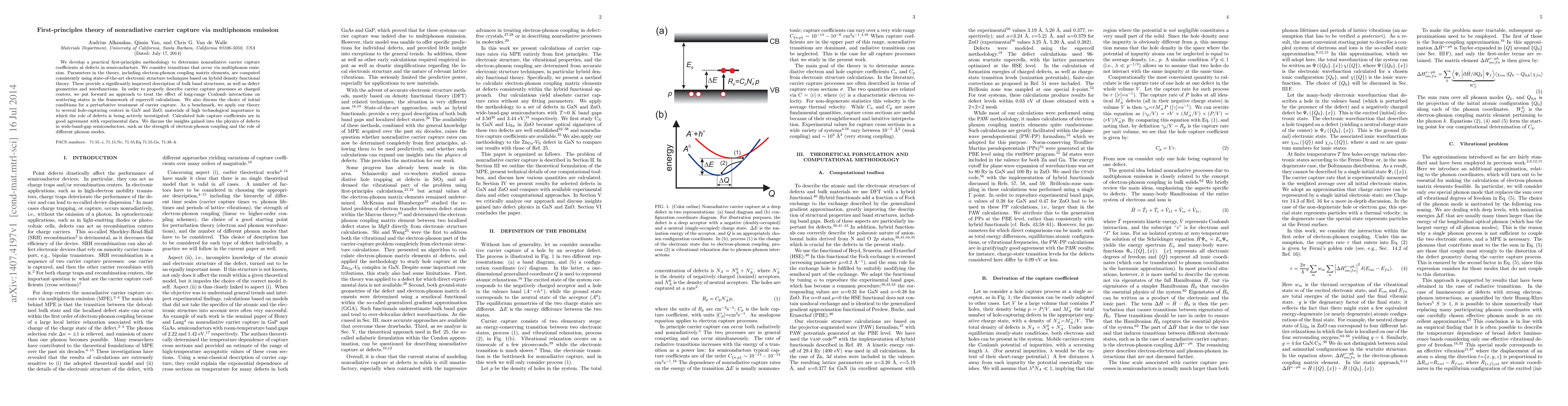 This paper presents a first-principles theory for calculating nonradiative carrier capture coefficients at defects in semiconductors via multiphonon emission, validated against experimental data for hole-capturing centers in GaN and ZnO. The methodology incorporates advanced electronic structure techniques to accurately model electron-phonon interactions and Coulomb interactions in supercell calculations.