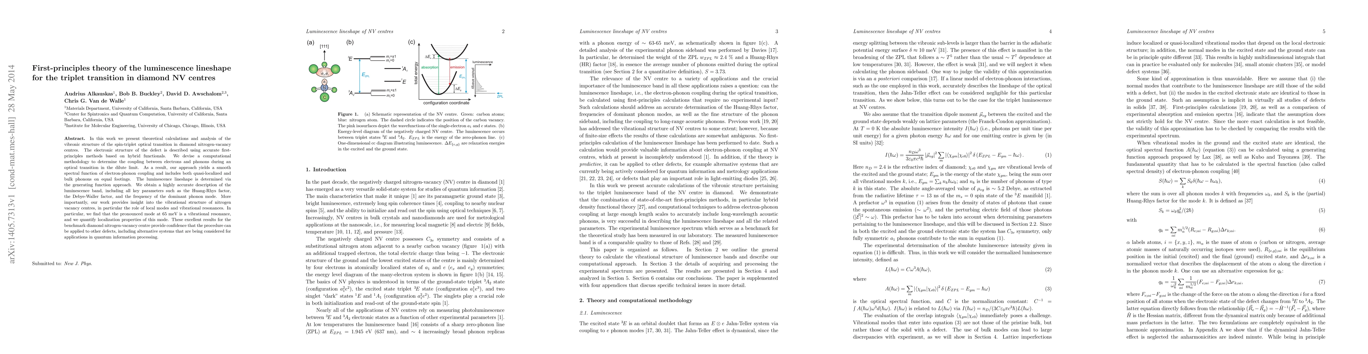 In this work we present theoretical calculations and analysis of the vibronic structure of the spin-triplet optical transition in diamond nitrogen-vacancy centres. The electronic structure of the defect is described using accurate first-principles methods based on hybrid functionals. We devise a computational methodology to determine the coupling between electrons and phonons during an optical transition in the dilute limit. As a result, our approach yields a smooth spectral function of electron-phonon coupling and includes both quasi-localized and bulk phonons on equal footings. The luminescence lineshape is determined via the generating function approach. We obtain a highly accurate description of the luminescence band, including all key parameters such as the Huang-Rhys factor, the Debye-Waller factor, and the frequency of the dominant phonon mode. More importantly, our work provides insight into the vibrational structure of nitrogen vacancy centres, in particular the role of local modes and vibrational resonances. In particular, we find that the pronounced mode at 65 meV is a vibrational resonance, and we quantify localization properties of this mode. These excellent results for the benchmark diamond nitrogen-vacancy centre provide confidence that the procedure can be applied to other defects, including alternative systems that are being considered for applications in quantum information processing.