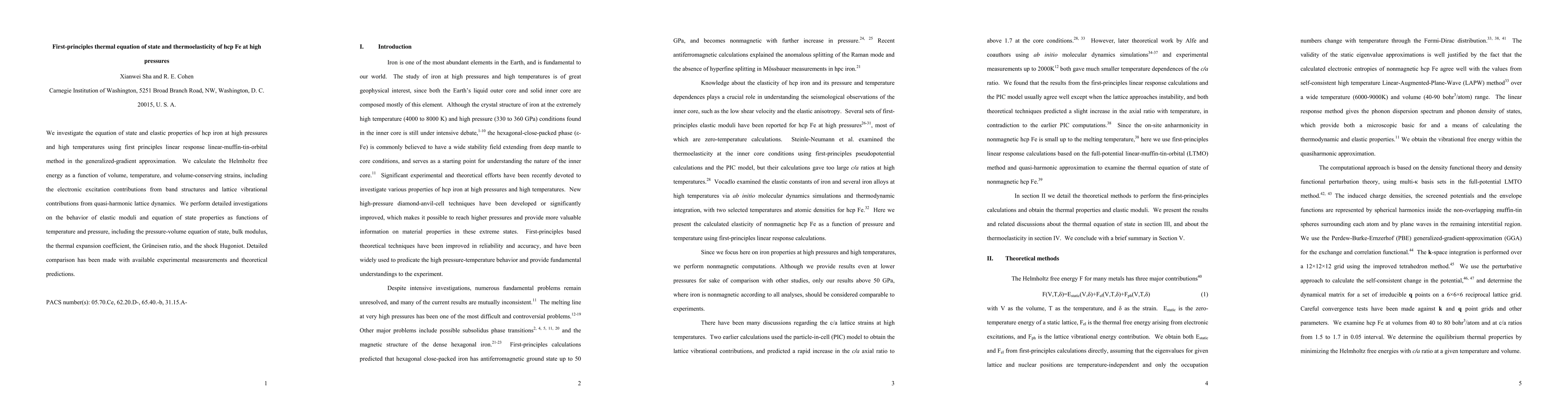 This study uses first-principles calculations to determine the thermal equation of state and thermoelastic properties of hcp iron under high pressures and temperatures. The research includes detailed analysis of elastic moduli, bulk modulus, thermal expansion, and shock Hugoniot, comparing results with experimental and theoretical data.
