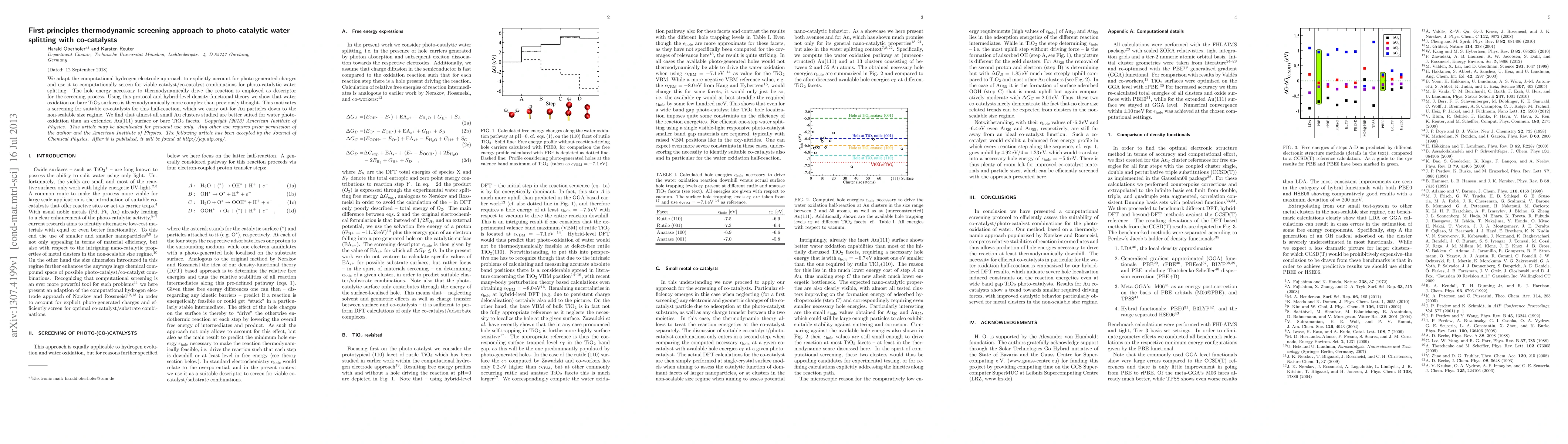 We adapt the computational hydrogen electrode approach to explicitly account for photo-generated charges and use it to computationally screen for viable catalyst/co-catalyst combinations for photo-catalytic water splitting. The hole energy necessary to thermodynamically drive the reaction is employed as descriptor for the screening process. Using this protocol and hybrid-level density-functional theory we show that water oxidation on bare TiO2 surfaces is thermodynamically more complex than previously thought. This motivates a screening for suitable co-catalysts for this half-reaction, which we carry out for Au particles down to the non-scalable size regime. We find that almost all small Au clusters studied are better suited for water photo-oxidation than an extended Au(111) surface or bare TiO2 facets.