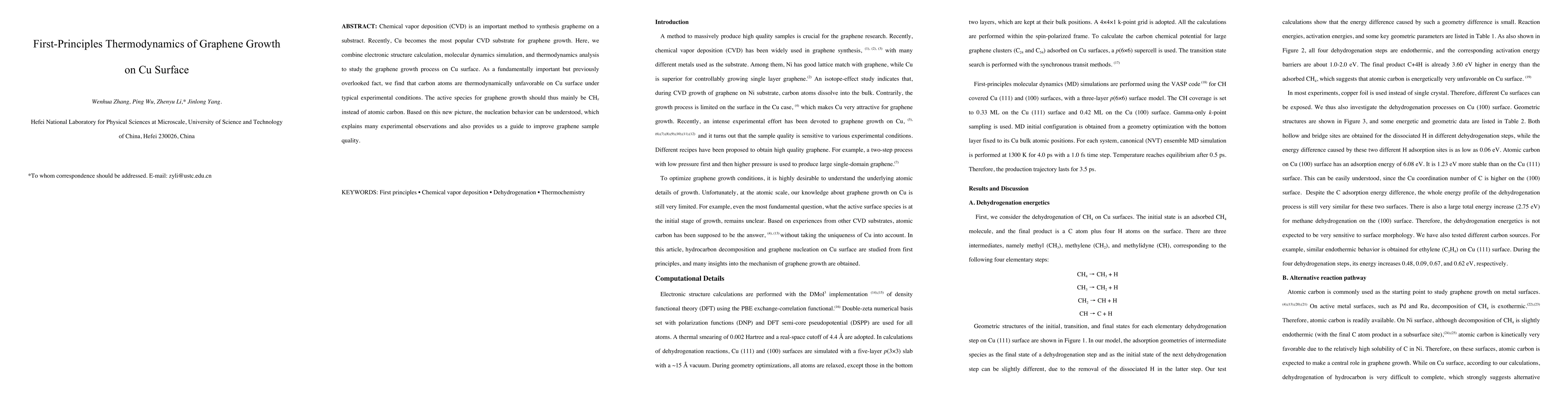 This study combines electronic structure calculations, molecular dynamics, and thermodynamics to investigate graphene growth on Cu via CVD. It reveals that carbon atoms are thermodynamically unfavorable on Cu, suggesting CHx species are the primary growth agents, which helps explain nucleation behavior and offers insights for enhancing graphene sample quality.