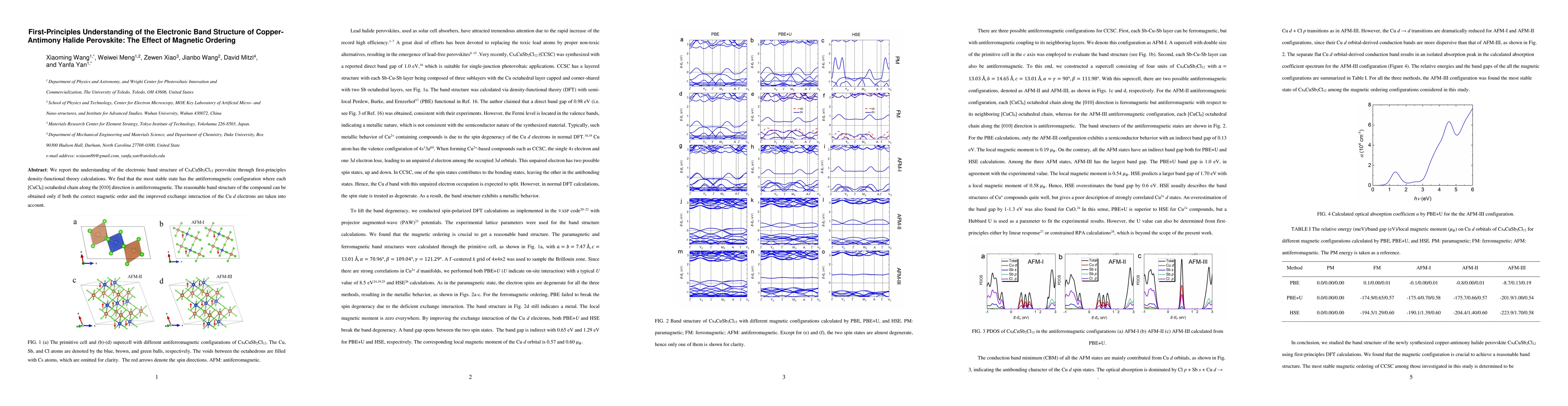 Researchers used density-functional theory to study the electronic band structure of a copper-antimony halide perovskite compound, finding that an antiferromagnetic configuration is most stable when correct magnetic order and electron exchange interactions are considered.