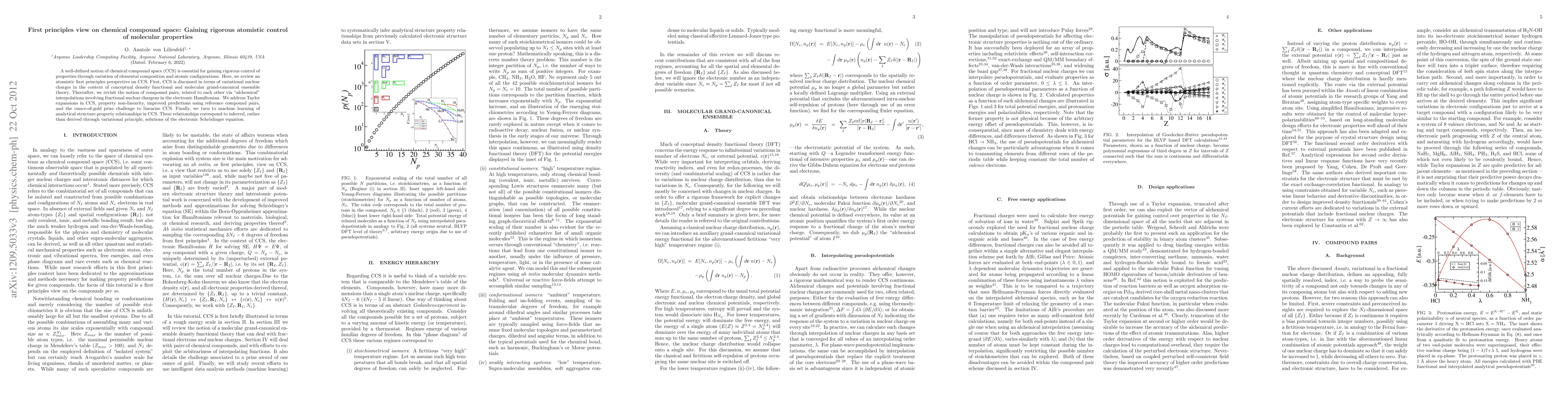 This paper reviews an atomistic first principles perspective on chemical compound space (CCS) to achieve rigorous control over molecular properties. It discusses variational nuclear charges and alchemical interpolations, addressing property non-linearity and machine learning approaches for predicting compound properties.