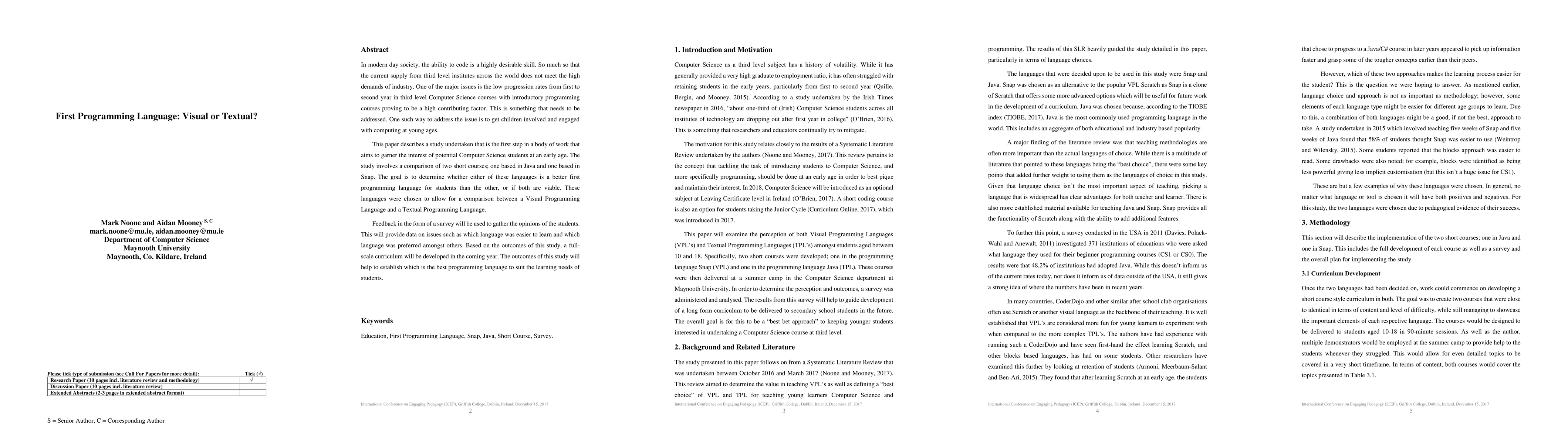 This study compares Java (textual) and Snap (visual) programming languages to determine which is more effective as a first programming language for students, aiming to improve progression rates in Computer Science courses. Feedback from students will guide the development of a future curriculum.