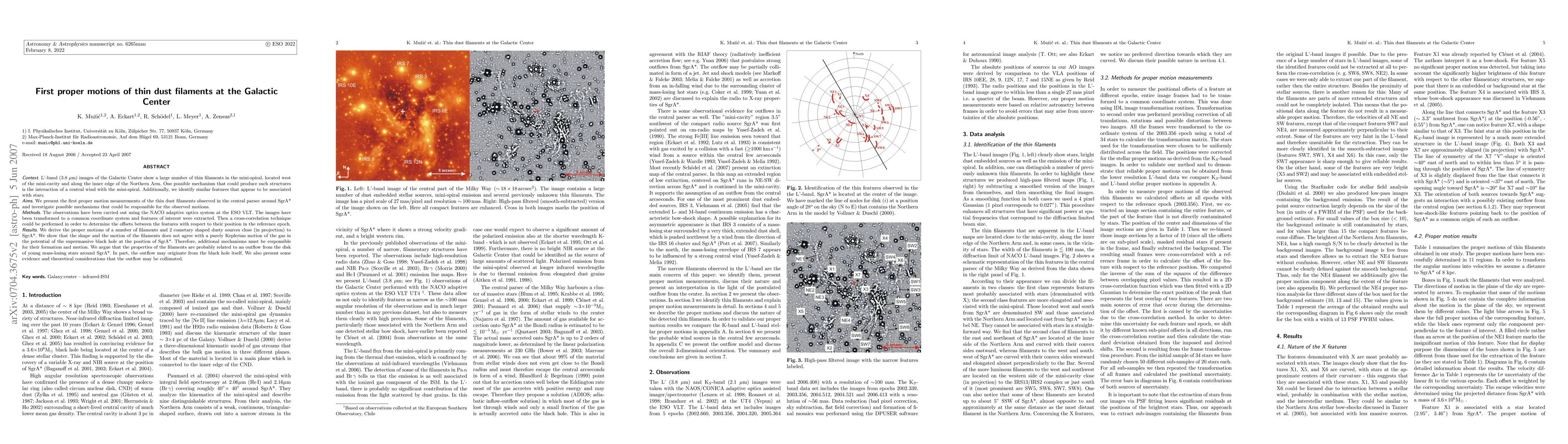 This study presents the first proper motion measurements of thin dust filaments near the Galactic Center's supermassive black hole, SgrA*. Using adaptive optics at the ESO VLT, researchers found that these filaments' motion doesn't align with Keplerian orbits around SgrA*. Instead, they suggest an outflow from a disk of young stars around the black hole, potentially collimated, is responsible for their formation and movement.