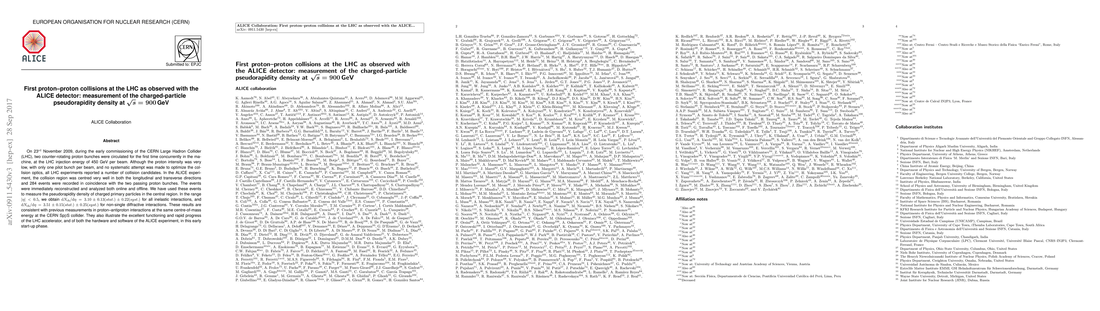 On 23rd November 2009, during the early commissioning of the CERN Large Hadron Collider (LHC), two counter-rotating proton bunches were circulated for the first time concurrently in the machine, at the LHC injection energy of 450 GeV per beam. Although the proton intensity was very low, with only one pilot bunch per beam, and no systematic attempt was made to optimize the collision optics, all LHC experiments reported a number of collision candidates. In the ALICE experiment, the collision region was centred very well in both the longitudinal and transverse directions and 284 events were recorded in coincidence with the two passing proton bunches. The events were immediately reconstructed and analyzed both online and offline. We have used these events to measure the pseudorapidity density of charged primary particles in the central region. In the range |$\eta$| < 0.5, we obtain dNch/deta = 3.10 $\pm$ 0.13 (stat.) $\pm$ 0.22 (syst.) for all inelastic interactions, and dNch/deta = 3.51 $\pm$ 0.15 (stat.) $\pm$ 0.25 (syst.) for non-single diffractive interactions. These results are consistent with previous measurements in proton-antiproton interactions at the same centre-of-mass energy at the CERN SppS collider. They also illustrate the excellent functioning and rapid progress of the LHC accelerator, and of both the hardware and software of the ALICE experiment, in this early start-up phase.