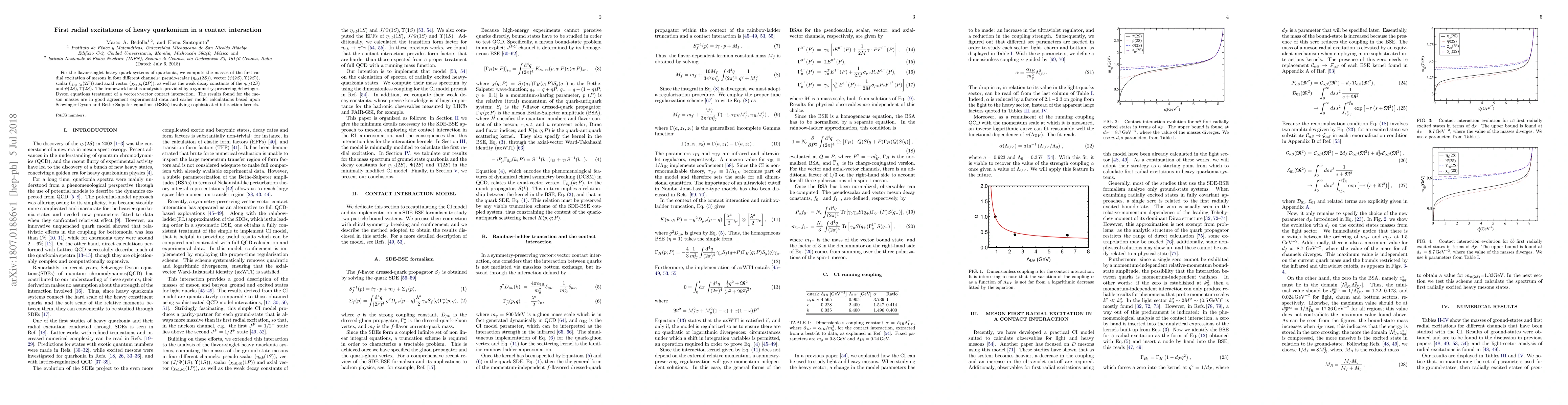 Researchers calculate masses of heavy quarkonium first radial excitation in four channels using a contact interaction framework, with results matching experimental data and previous calculations.
