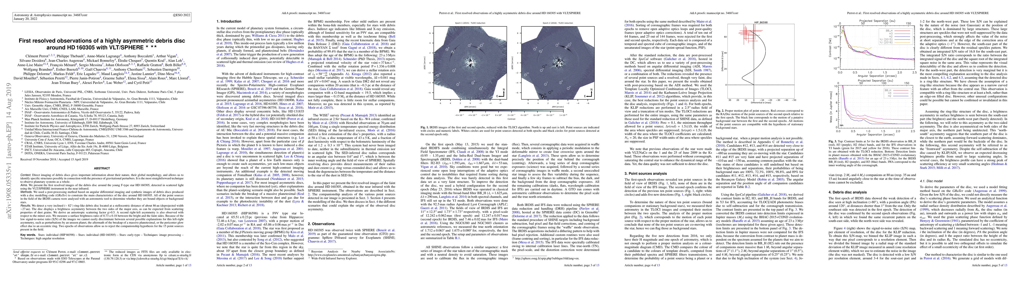 Context. Direct imaging of debris discs gives important information about their nature, their global morphology, and allows us to identify specific structures possibly in connection with the presence of gravitational perturbers. It is the most straightforward technique to observe planetary systems as a whole. Aims. We present the first resolved images of the debris disc around the young F-type star HD 160305, detected in scattered light using the VLT/SPHERE instrument in the near infrared. Methods. We used a post-processing method based on angular differential imaging and synthetic images of debris discs produced with a disc modelling code (GRaTer) to constrain the main characteristics of the disc around HD 160305. All of the point sources in the field of the IRDIS camera were analysed with an astrometric tool to determine whether they are bound objects or background stars. Results. We detect a very inclined (~ 82{\deg}) ring-like debris disc located at a stellocentric distance of about 86au (deprojected width ~27 au). The disc displays a brightness asymmetry between the two sides of the major axis, as can be expected from scattering properties of dust grains. We derive an anisotropic scattering factor g>0.5. A second right-left asymmetry is also observed with respect to the minor axis. We measure a surface brightness ratio of 0.73 $\pm$ 0.18 between the bright and the faint sides. Because of the low signal-to-noise ratio (S/N) of the images we cannot easily discriminate between several possible explanations for this left-right asymmetry, such as perturbations by an unseen planet, the aftermath of the breakup of a massive planetesimal, or the pericenter glow effect due to an eccentric ring. Two epochs of observations allow us to reject the companionship hypothesis for the 15 point sources present in the field.