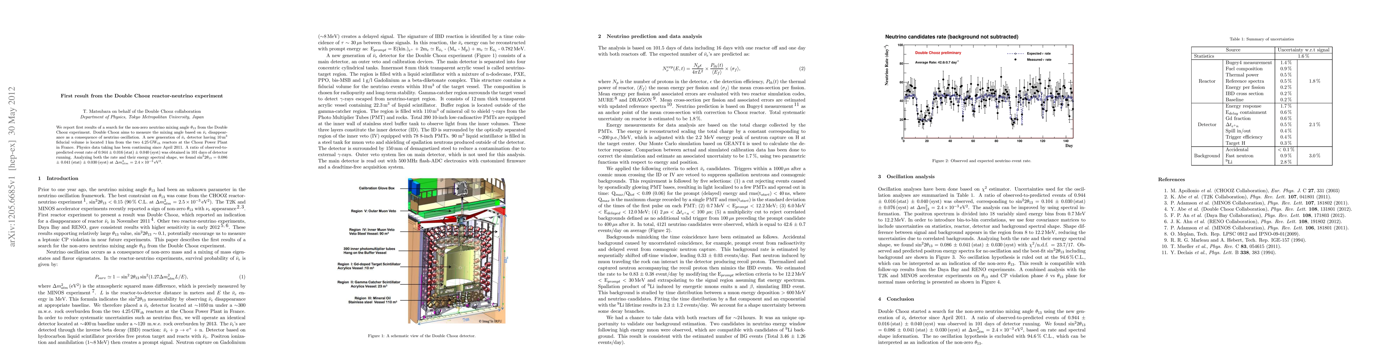 The Double Chooz experiment uses an anti-electron-neutrino detector with a 10 m³ fiducial volume located 1 km from two 4.25 GW_th reactors at the Chooz Power Plant in France. The analysis is based on 101.5 days of data, including periods with one reactor off and both reactors off. Neutrino events are identified by the time coincidence of prompt and delayed signals resulting from inverse beta decay (IBD) reactions.