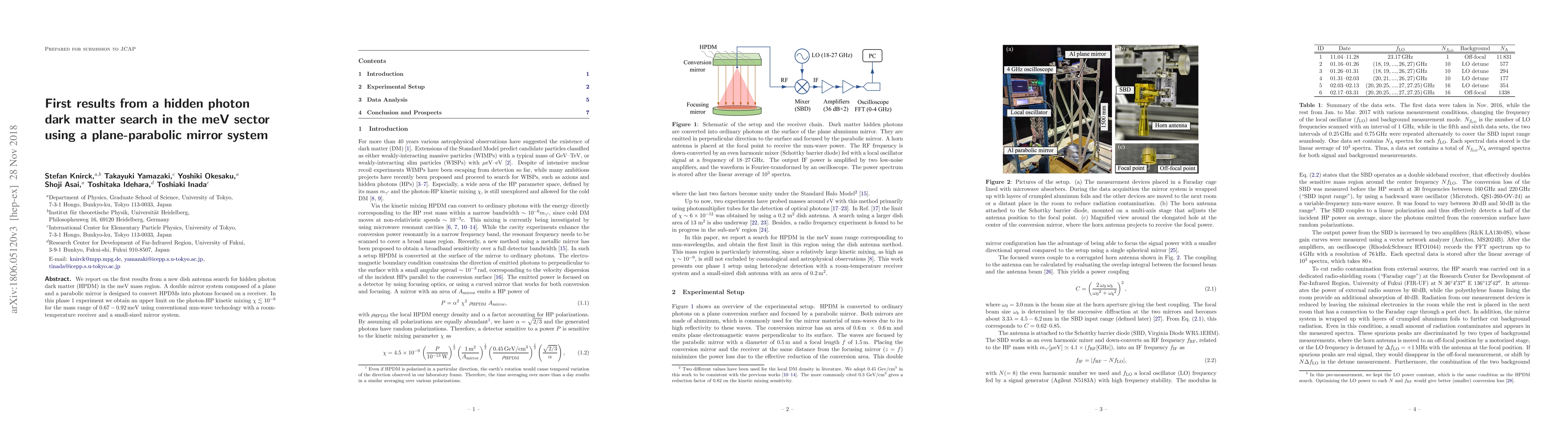 This paper presents initial findings from a novel search for hidden photon dark matter using a plane-parabolic mirror system to convert HPDMs into detectable photons. The experiment sets an upper limit of $\chi \lesssim 10^{-8}$ for photon-HP kinetic mixing in the meV mass range.