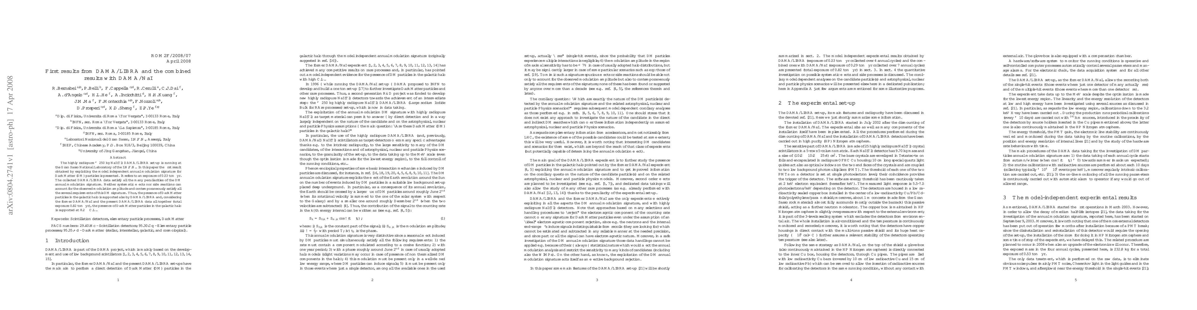 The DAMA/LIBRA experiment reports its first result supporting Dark Matter particles in the galactic halo at 8.2 sigma confidence level, with a combined exposure of 0.82 ton-years.