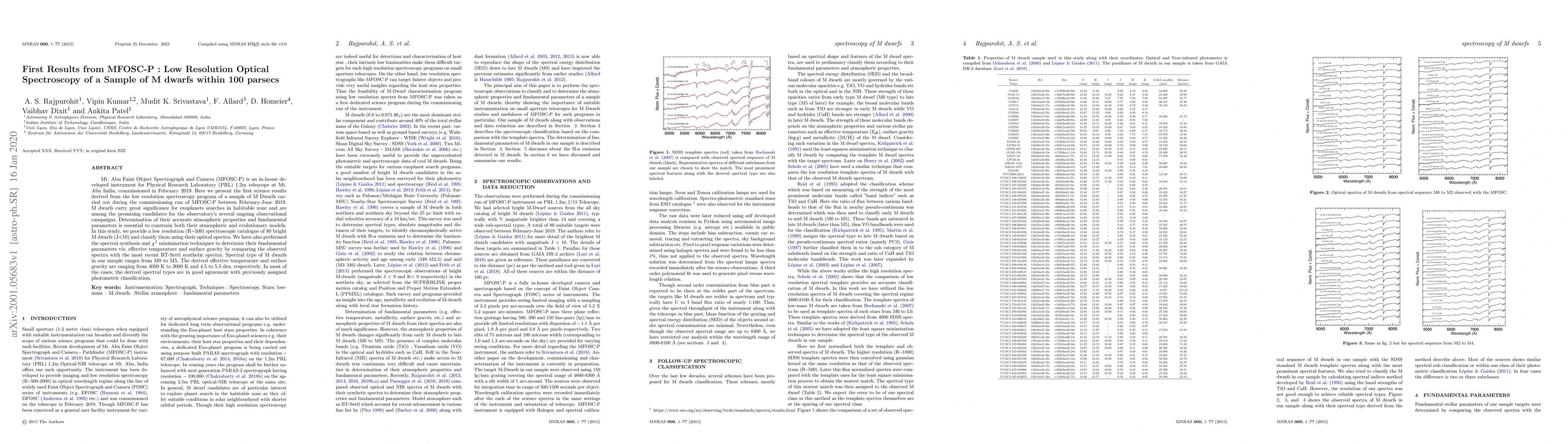 This paper presents the first results from the MFOSC-P instrument, using low-resolution spectroscopy to analyze 80 bright M dwarfs within 100 parsecs. The study classifies these stars and determines their fundamental parameters, finding effective temperatures ranging from 4000 K to 3000 K and surface gravities from 4.5 to 5.5 dex.