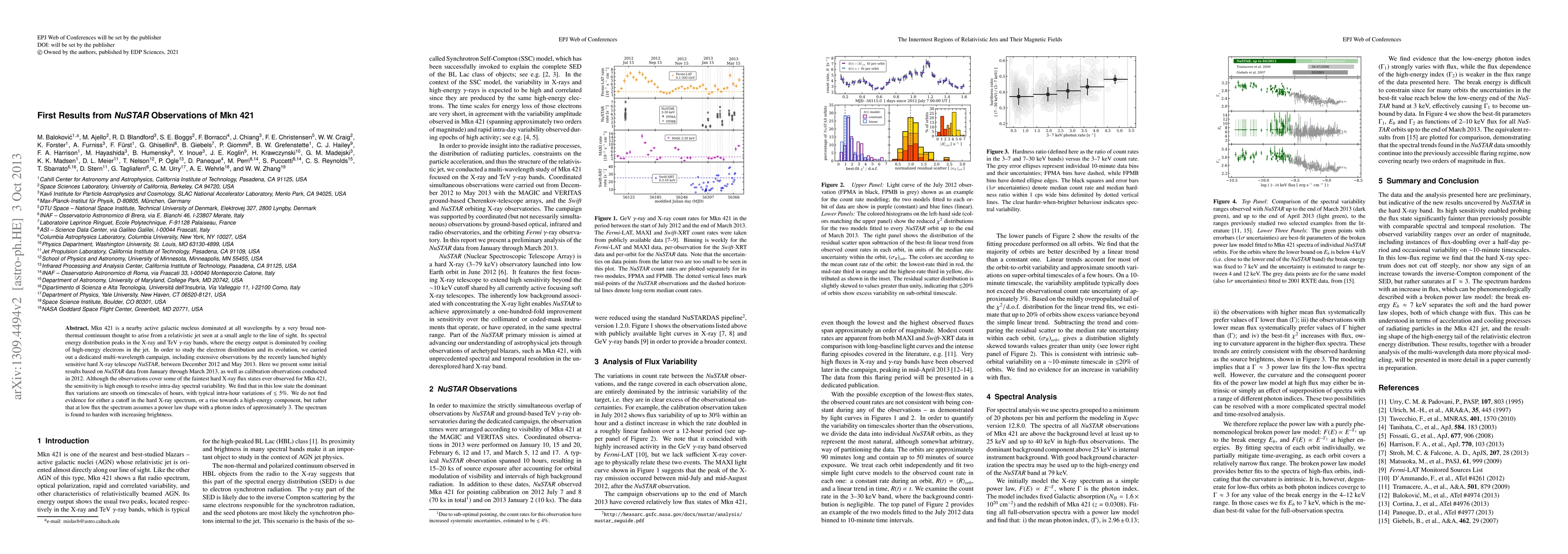 The NuSTAR telescope observed Mkn 421's hard X-ray spectrum, finding a power-law shape with a photon index of approximately 3 in low-flux states, which harden with increasing brightness.
