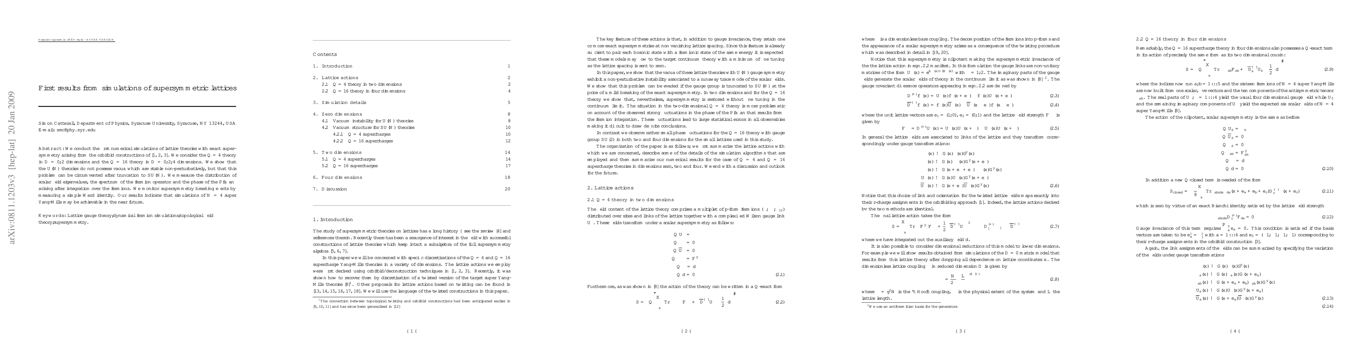 We conduct the first numerical simulations of lattice theories with exact supersymmetry arising from the orbifold constructions of \cite{Cohen:2003xe,Cohen:2003qw,Kaplan:2005ta}. We consider the $\cQ=4$ theory in $D=0,2$ dimensions and the $\cQ=16$ theory in $D=0,2,4$ dimensions. We show that the U(N) theories do not possess vacua which are stable non-perturbatively, but that this problem can be circumvented after truncation to SU(N). We measure the distribution of scalar field eigenvalues, the spectrum of the fermion operator and the phase of the Pfaffian arising after integration over the fermions. We monitor supersymmetry breaking effects by measuring a simple Ward identity. Our results indicate that simulations of ${\cal N}=4$ super Yang-Mills may be achievable in the near future.