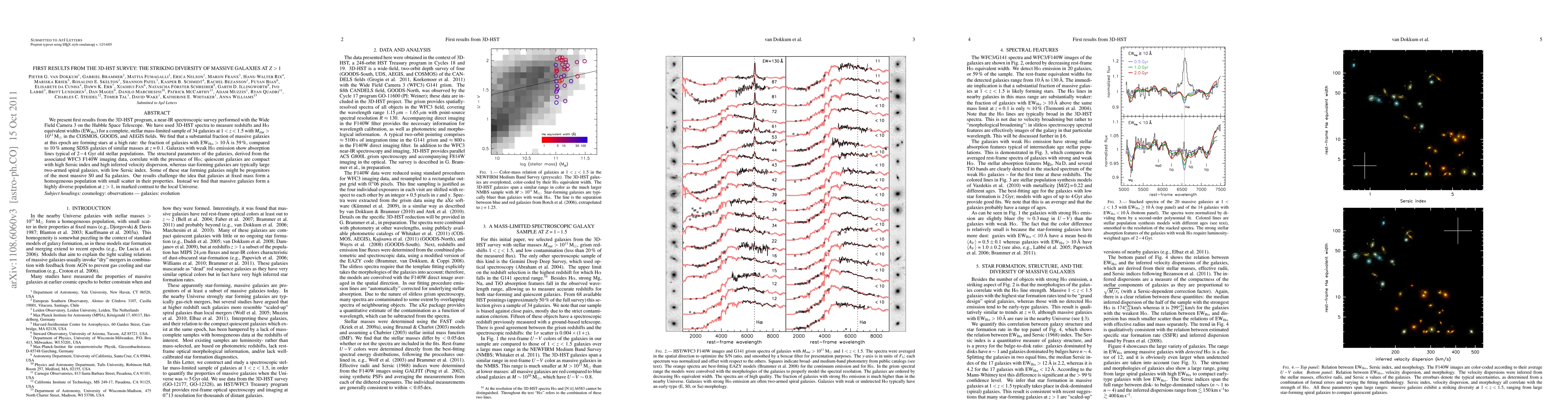 The 3D-HST survey reveals that massive galaxies at z>1 exhibit significant diversity, with 59% forming stars at high rates compared to only 10% in similar local galaxies. The structural parameters correlate with star-forming activity, indicating that star-forming galaxies are large spirals while quiescent galaxies are compact, suggesting a heterogeneous population at this epoch.