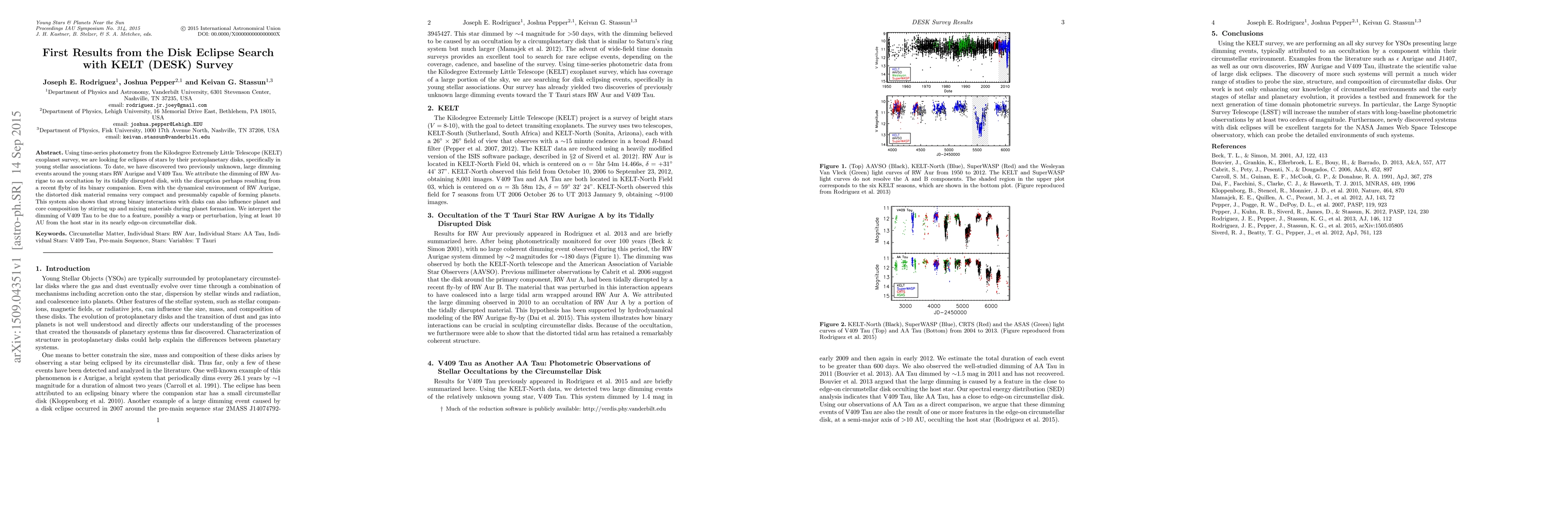 Using time-series photometry from the Kilodegree Extremely Little Telescope (KELT) exoplanet survey, we are looking for eclipses of stars by their protoplanetary disks, specifically in young stellar associations. To date, we have discovered two previously unknown, large dimming events around the young stars RW Aurigae and V409 Tau. We attribute the dimming of RW Aurigae to an occultation by its tidally disrupted disk, with the disruption perhaps resulting from a recent flyby of its binary companion. Even with the dynamical environment of RW Aurigae, the distorted disk material remains very compact and presumably capable of forming planets. This system also shows that strong binary interactions with disks can also influence planet and core composition by stirring up and mixing materials during planet formation. We interpret the dimming of V409 Tau to be due to a feature, possibly a warp or perturbation, lying at least 10 AU from the host star in its nearly edge-on circumstellar disk.