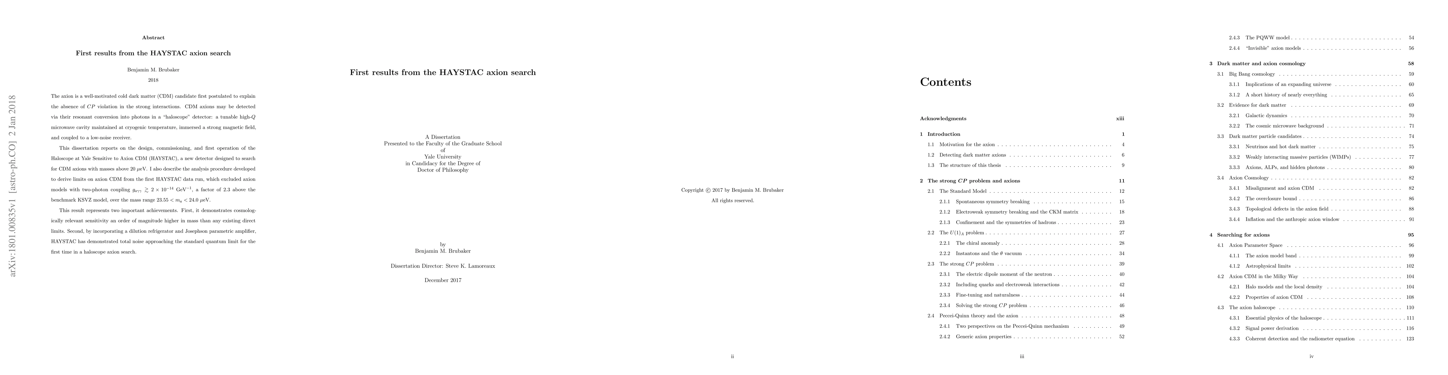 The axion is a well-motivated cold dark matter (CDM) candidate first postulated to explain the absence of $CP$ violation in the strong interactions. CDM axions may be detected via their resonant conversion into photons in a "haloscope" detector: a tunable high-$Q$ microwave cavity maintained at cryogenic temperature, immersed a strong magnetic field, and coupled to a low-noise receiver. This dissertation reports on the design, commissioning, and first operation of the Haloscope at Yale Sensitive to Axion CDM (HAYSTAC), a new detector designed to search for CDM axions with masses above $20$ $\mu\mathrm{eV}$. I also describe the analysis procedure developed to derive limits on axion CDM from the first HAYSTAC data run, which excluded axion models with two-photon coupling $g_{a\gamma\gamma} \gtrsim 2\times10^{-14}$ $\mathrm{GeV}^{-1}$, a factor of 2.3 above the benchmark KSVZ model, over the mass range $23.55 < m_a < 24.0$ $\mu\mathrm{eV}$. This result represents two important achievements. First, it demonstrates cosmologically relevant sensitivity an order of magnitude higher in mass than any existing direct limits. Second, by incorporating a dilution refrigerator and Josephson parametric amplifier, HAYSTAC has demonstrated total noise approaching the standard quantum limit for the first time in a haloscope axion search.