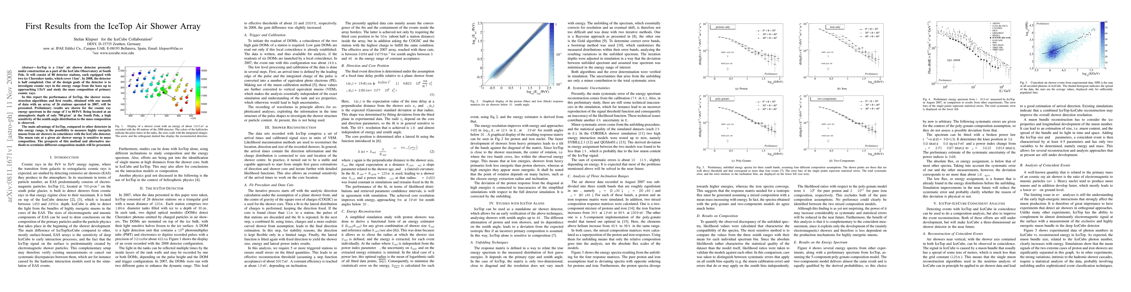 This paper presents the initial results from the IceTop air shower detector, part of the IceCube Observatory at the South Pole, which aims to study cosmic rays in the energy range from 1 to 80 PeV. Preliminary data from 26 operational stations in 2007 show a high sensitivity to the zenith angle distribution, indicating potential insights into the mass composition of primary cosmic rays.