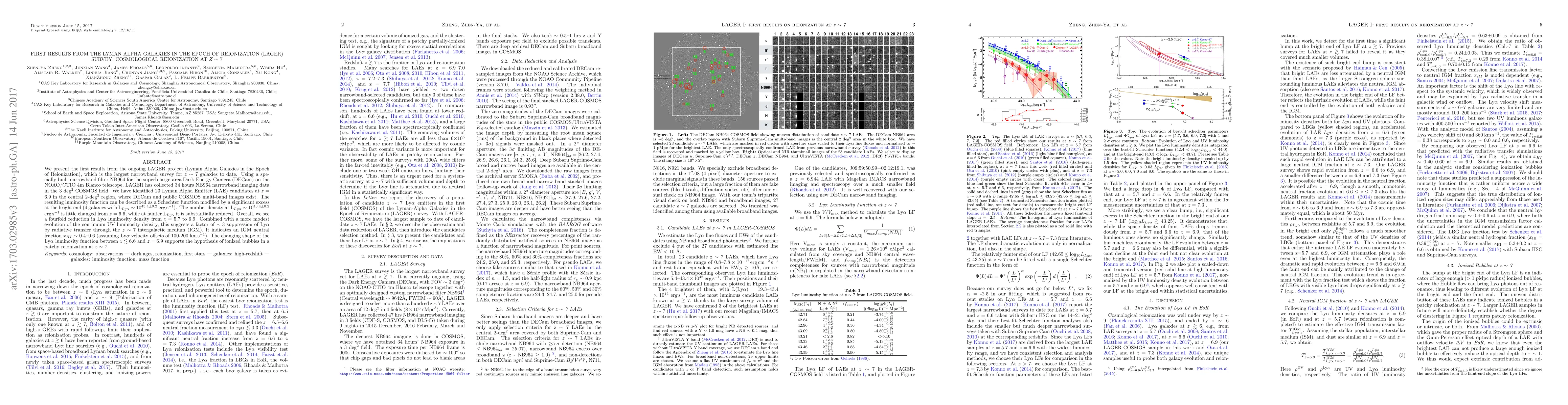 We present the first results from the ongoing LAGER project (Lyman Alpha Galaxies in the Epoch of Reionization), which is the largest narrowband survey for $z \sim$ 7 galaxies to date. Using a specially built narrowband filter NB964 for the superb large-area Dark-Energy Camera (DECam) on the NOAO/CTIO 4m Blanco telescope, LAGER has collected 34 hours NB964 narrowband imaging data in the 3 deg$^2$ COSMOS field. We have identified 23 Lyman Alpha Emitter (LAE) candidates at $z$ = 6.9 in the central 2-deg$^2$ region, where DECam and public COSMOS multi-band images exist. The resulting luminosity function can be described as a Schechter function modified by a significant excess at the bright end (4 galaxies with $L_{Ly\alpha} \sim $ 10$^{43.4\pm0.2}$ erg s$^{-1}$). The number density at $L_{Ly\alpha}\sim$ 10$^{43.4\pm0.2}$ erg s$^{-1}$ is little changed from z= 6.6, while at fainter $L_{Ly\alpha}$ it is substantially reduced. Overall, we see a fourfold reduction in Ly$\alpha$ luminosity density from $z$ = 5.7 to 6.9. Combined with a more modest evolution of the continuum UV luminosity density, this suggests a factor of $\sim 3$ suppression of Ly$\alpha$ by radiative transfer through the $z \sim$ 7 intergalactic medium (IGM). It indicates an IGM neutral fraction $x_{HI}$ $\sim$ 0.4--0.6 (assuming Ly$\alpha$ velocity offsets of 100-200 km s$^{-1}$). The changing shape of the Ly$\alpha$ luminosity function between $z\lesssim 6.6$ and $z=6.9$ supports the hypothesis of ionized bubbles in a patchy reionization at $z\sim$ 7.