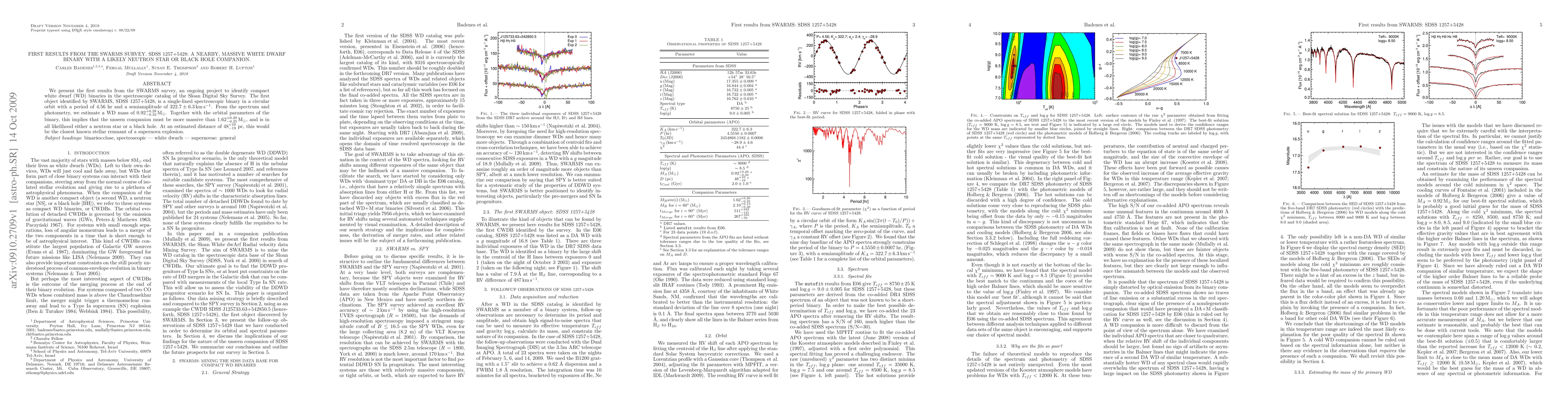 The SWARMS survey identifies SDSS 1257+5428 as a nearby massive white dwarf binary with a likely neutron star or black hole companion, based on its spectroscopic orbit and mass estimates. This system, at a distance of 48 pc, could be the closest known remnant of a supernova explosion.