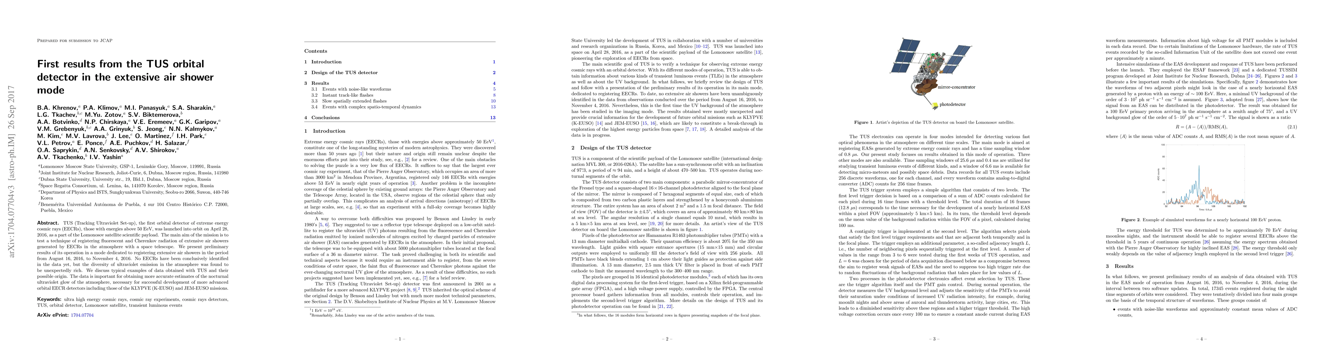 TUS (Tracking Ultraviolet Set-up), the first orbital detector of extreme energy cosmic rays (EECRs), those with energies above 50 EeV, was launched into orbit on April 28, 2016, as a part of the Lomonosov satellite scientific payload. The main aim of the mission is to test a technique of registering fluorescent and Cherenkov radiation of extensive air showers generated by EECRs in the atmosphere with a space telescope. We present preliminary results of its operation in a mode dedicated to registering extensive air showers in the period from August 16, 2016, to November 4, 2016. No EECRs have been conclusively identified in the data yet, but the diversity of ultraviolet emission in the atmosphere was found to be unexpectedly rich. We discuss typical examples of data obtained with TUS and their possible origin. The data is important for obtaining more accurate estimates of the nocturnal ultraviolet glow of the atmosphere, necessary for successful development of more advanced orbital EECR detectors including those of the KLYPVE (K-EUSO) and JEM-EUSO missions.