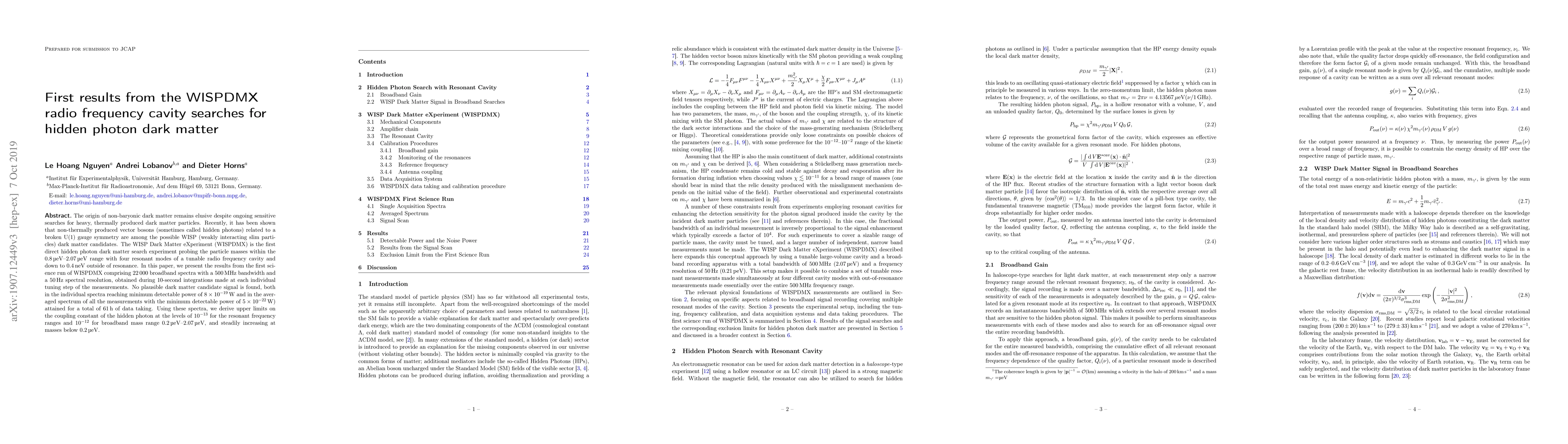 The WISPDMX experiment conducted the first direct search for hidden photon dark matter, finding no evidence of a signal within the 0.8-2.07 $\mu$eV mass range. The study sets stringent upper limits on the hidden photon coupling constant, improving constraints on this dark matter candidate.