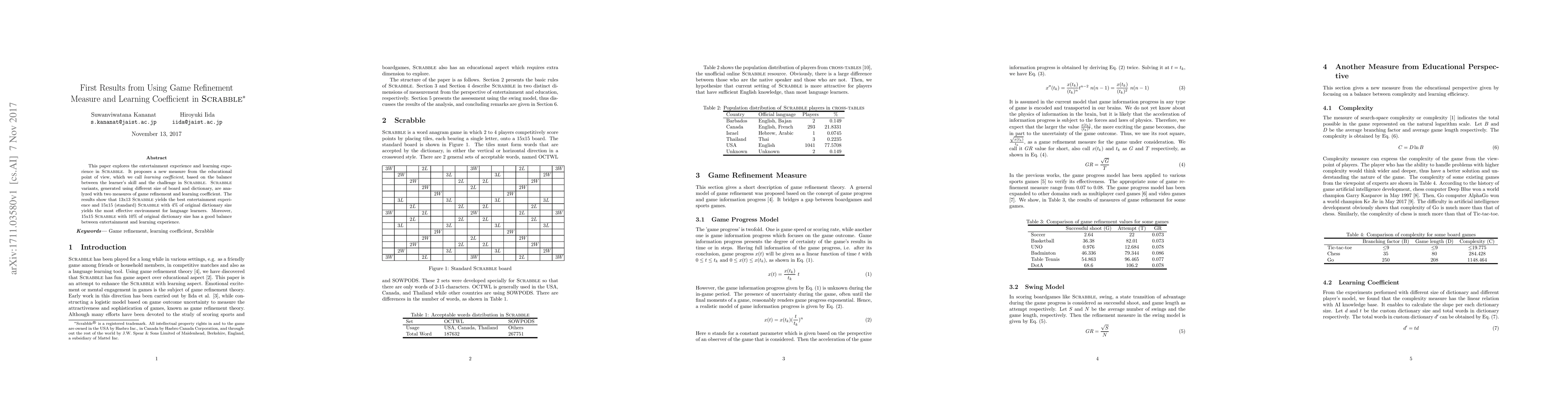 This paper explores the entertainment experience and learning experience in Scrabble. It proposes a new measure from the educational point of view, which we call learning coefficient, based on the balance between the learner's skill and the challenge in Scrabble. Scrabble variants, generated using different size of board and dictionary, are analyzed with two measures of game refinement and learning coefficient. The results show that 13x13 Scrabble yields the best entertainment experience and 15x15 (standard) Scrabble with 4% of original dictionary size yields the most effective environment for language learners. Moreover, 15x15 Scrabble with 10% of original dictionary size has a good balance between entertainment and learning experience.