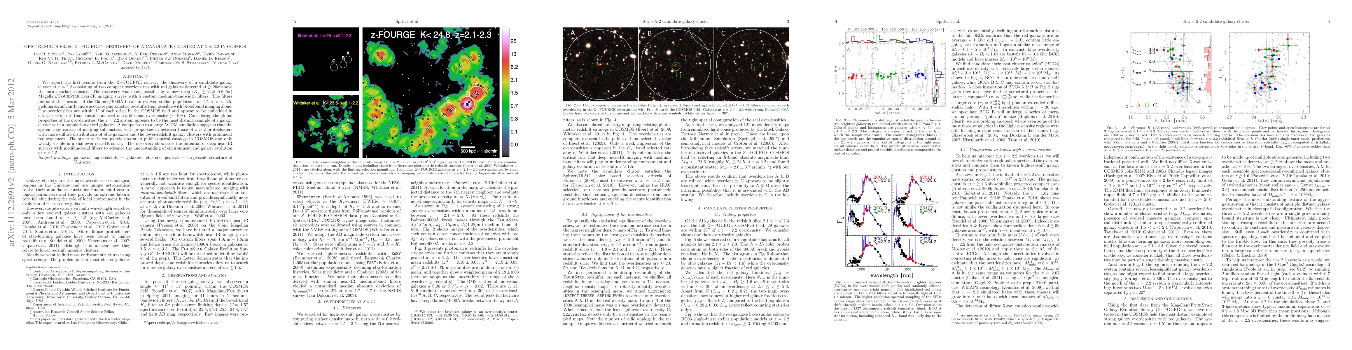 The Z-FOURGE survey discovered a candidate galaxy cluster at z = 2.2 in COSMOS, identified through deep near-IR imaging with medium-band filters that enhance photometric redshift accuracy. The cluster appears to be merging subclusters, bridging the gap between high-redshift protoclusters and lower-redshift clusters, highlighting the survey's potential for studying galaxy evolution at high redshifts.