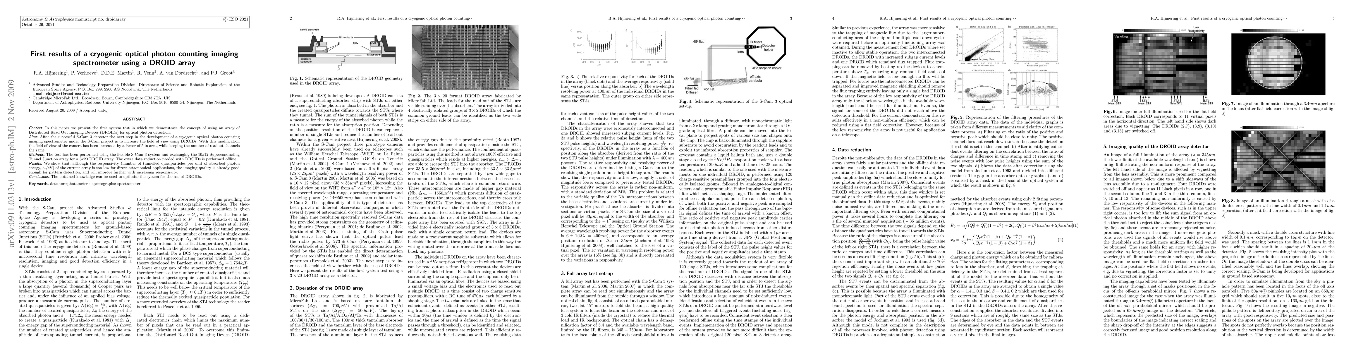 Context. In this paper we present the first system test in which we demonstrate the concept of using an array of Distributed Read Out Imaging Devices (DROIDs) for optical photon detection. Aims. After the successful S-Cam 3 detector the next step in the development of a cryogenic optical photon counting imaging spectrometer under the S-Cam project is to increase the field of view using DROIDs. With this modification the field of view of the camera has been increased by a factor of 5 in area, while keeping the number of readout channels the same. Methods. The test has been performed using the flexible S-Cam 3 system and exchanging the 10x12 Superconducting Tunnel Junction array for a 3x20 DROID array. The extra data reduction needed with DROIDs is performed offline. Results. We show that, although the responsivity (number of tunnelled quasiparticles per unit of absorbed photon energy, e- /eV) of the current array is too low for direct astronomical applications, the imaging quality is already good enough for pattern detection, and will improve further with increasing responsivity. Conclusions. The obtained knowledge can be used to optimise the system for the use of DROIDs.