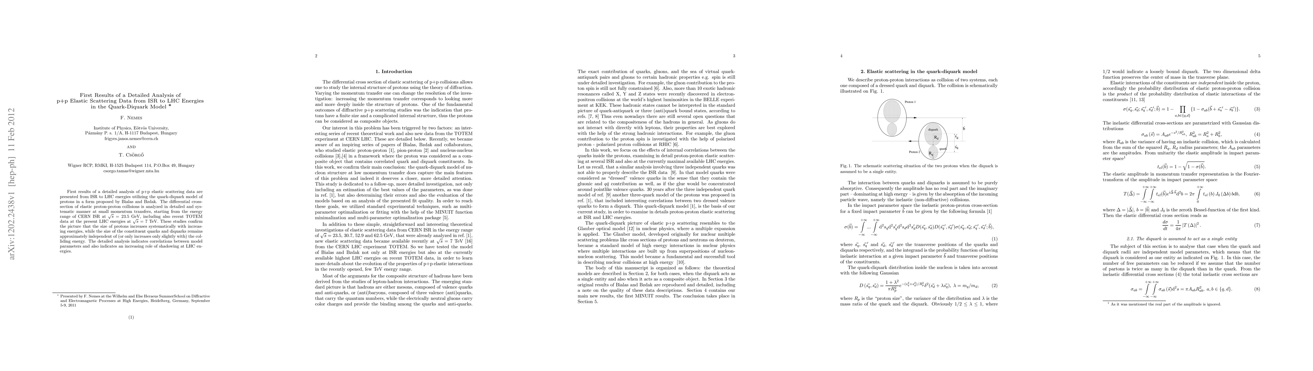 First results of a detailed analysis of p+p elastic scattering data are presented from ISR to LHC energies utilizing the quark-diquark model of protons in a form proposed by Bialas and Bzdak. The differential cross-section of elastic proton-proton collisions is analyzed in detailed and systematic manner at small momentum transfers, starting from the energy range of CERN ISR at $\sqrt{s}= 23.5$ GeV, including also recent TOTEM data at the present LHC energies at $\sqrt{s} = 7$ TeV. These studies confirm the picture that the size of protons increases systematically with increasing energies, while the size of the constituent quarks and diquarks remains approximately independent of (or only increases only slightly with) the colliding energy. The detailed analysis indicates correlations between model parameters and also indicates an increasing role of shadowing at LHC energies.
