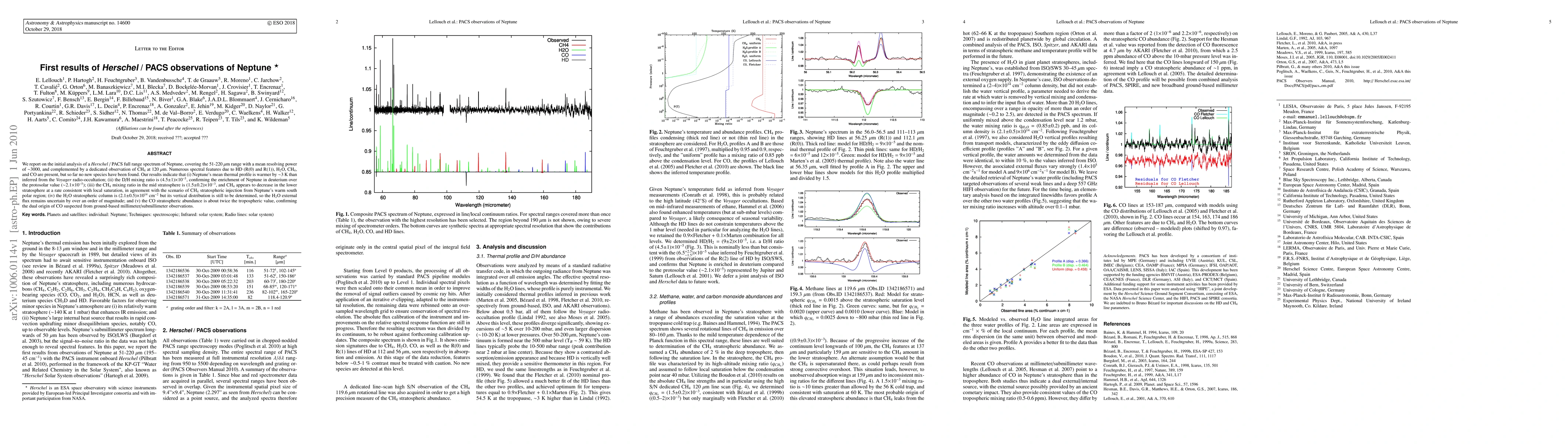 This study presents initial findings from Herschel/PACS observations of Neptune, revealing a warmer thermal profile and confirming the enrichment of deuterium. It also identifies methane, water, and carbon monoxide in Neptune's atmosphere, with notable variations in their mixing ratios and vertical distribution.