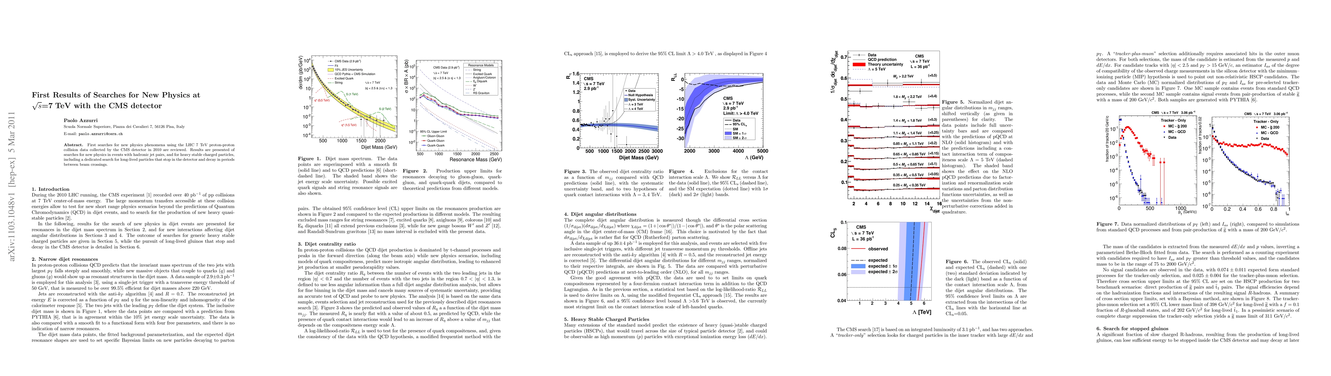 First searches for new physics phenomena using the LHC 7 TeV proton-proton collision data collected by the CMS detector in 2010 are reviewed. Results are presented of searches for new physics in events with hadronic jet pairs, and for heavy stable charged particles, including a dedicated search for long-lived particles that stop in the detector and decay in periods between beam crossings.
