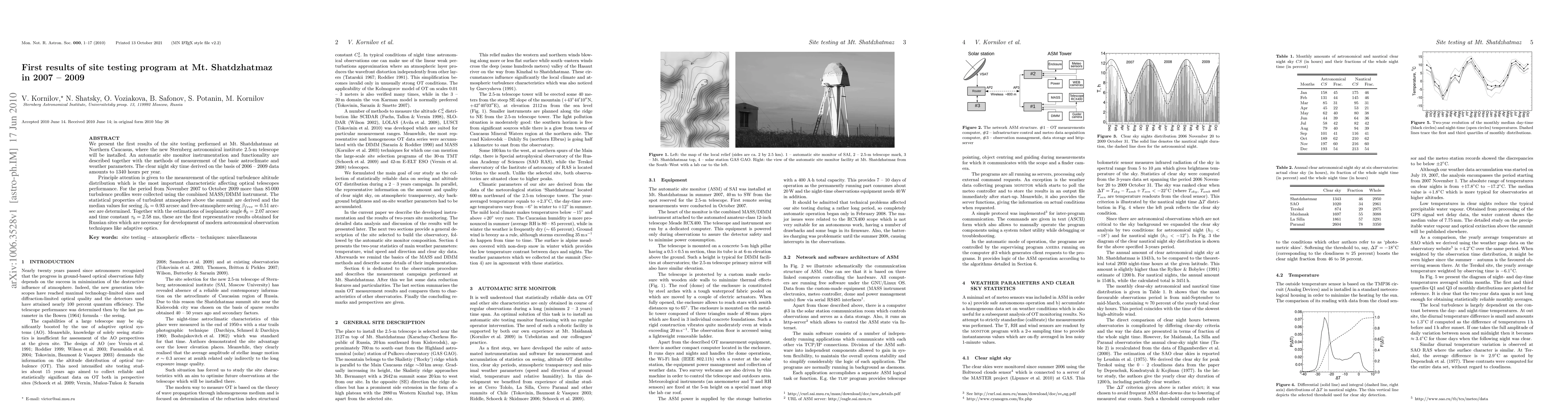 We present the first results of the site testing performed at Mt.~Shatdzhatmaz at Northern Caucasus, where the new Sternberg astronomical institute 2.5-m telescope will be installed. An automatic site monitor instrumentation and functionality are described together with the methods of measurement of the basic astroclimate and weather parameters. The clear night sky time derived on the basis of 2006 -- 2009 data amounts to 1340 hours per year. Principle attention is given to the measurement of the optical turbulence altitude distribution which is the most important characteristic affecting optical telescopes performance. For the period from November 2007 to October 2009 more than 85\,000 turbulence profiles were collected using the combined MASS/DIMM instrument. The statistical properties of turbulent atmosphere above the summit are derived and the median values for seeing $\beta_0 = 0.93$~arcsec and free-atmosphere seeing $\beta_{free} = 0.51$~arcsec are determined. Together with the estimations of isoplanatic angle $\theta_0 = 2.07$~arcsec and time constant $\tau_0 = 2.58 \mbox{ ms}$, these are the first representative results obtained for Russian sites which are necessary for development of modern astronomical observation techniques like adaptive optics.