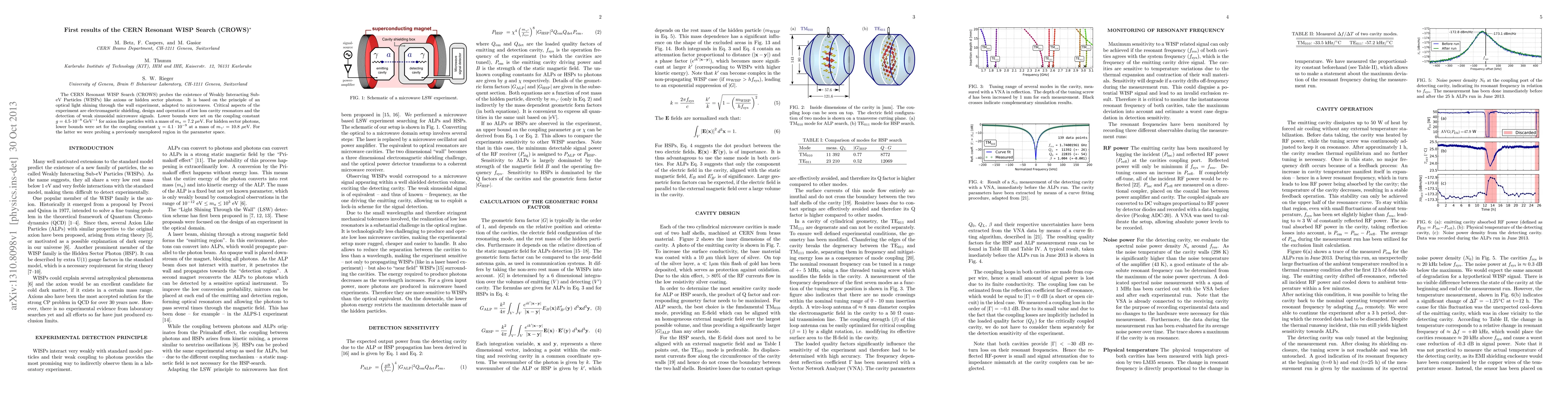 The CERN Resonant WISP Search (CROWS) probes the existence of Weakly Interacting Sub-eV Particles (WISPs) like axions or hidden sector photons. It is based on the principle of an optical light shining through the wall experiment, adapted to microwaves. Critical aspects of the experiment are electromagnetic shielding, design and operation of low loss cavity resonators and the detection of weak sinusoidal microwave signals. Lower bounds were set on the coupling constant $g = 4.5 \cdot 10^{-8} $GeV$^{-1}$ for axion like particles with a mass of $m_a = 7.2 \mu$eV. For hidden sector photons, lower bounds were set for the coupling constant $\chi = 4.1 \cdot 10^{-9}$ at a mass of $m_{\gamma'} = 10.8 \mu$eV. For the latter we were probing a previously unexplored region in the parameter space.