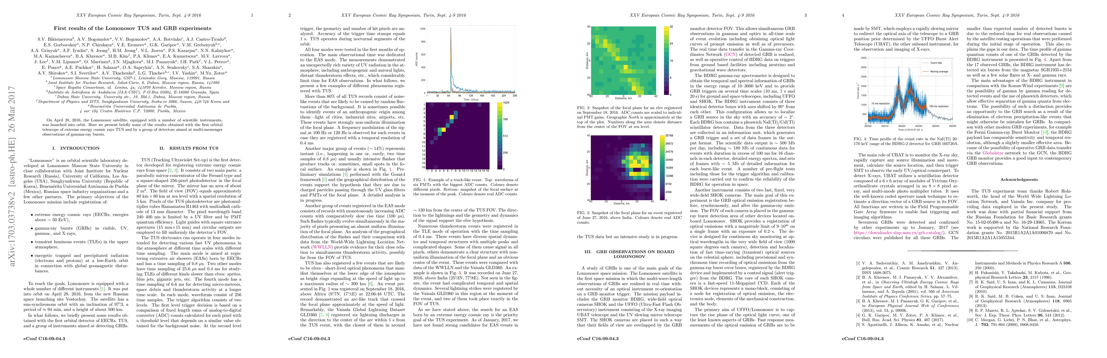 The paper reports initial findings from the Lomonosov satellite's TUS (Lomonosov Telescope for Ultra-high Energy Cosmic Rays) and gamma-ray burst (GRB) detectors, launched in April 2016. TUS has detected cosmic rays above 10^20 eV, while the GRB detectors have contributed to multi-messenger observations.