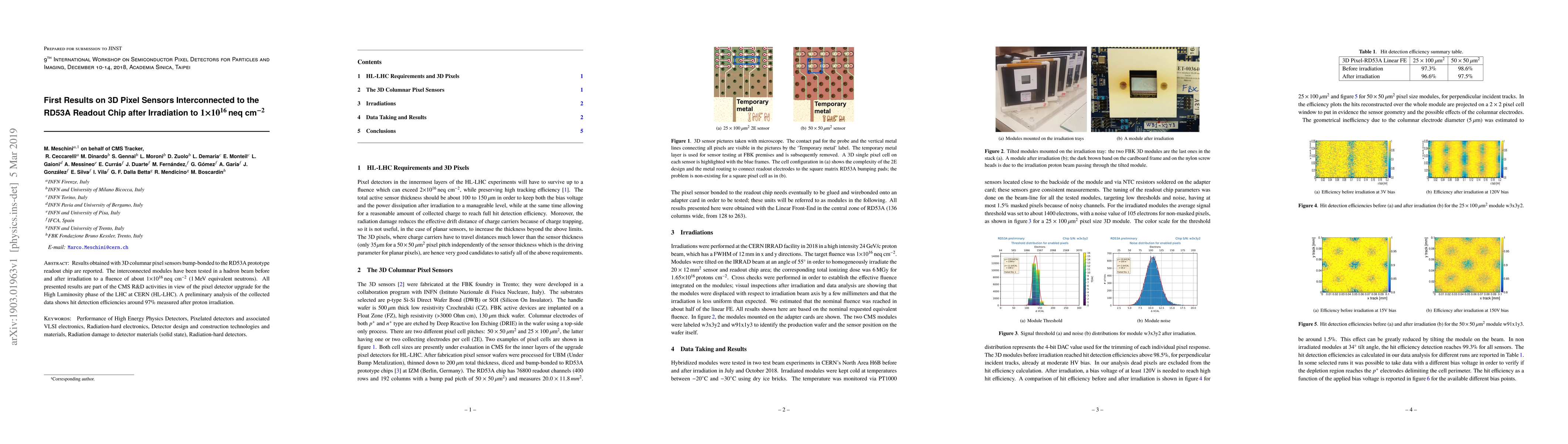 This paper reports initial results on 3D columnar pixel sensors connected to the RD53A readout chip, tested before and after irradiation to $1\times10^{16}$ neq cm$^{-2}$. Hit detection efficiency remains around 97% post-irradiation, relevant for the CMS pixel detector upgrade for the HL-LHC.