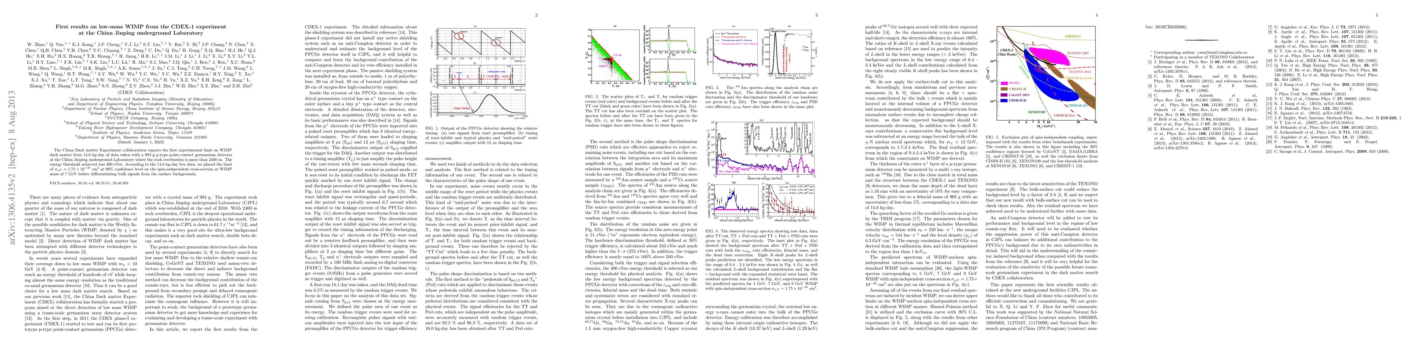 The CDEX-1 experiment at China Jinping underground Laboratory set the first experimental limit on low-mass WIMP dark matter using a germanium detector, achieving an energy threshold of 400 eVee and placing a limit of N=1.75 * 10^{-40} cm^{2} on the spin-independent cross-section at a WIMP mass of 7 GeV.