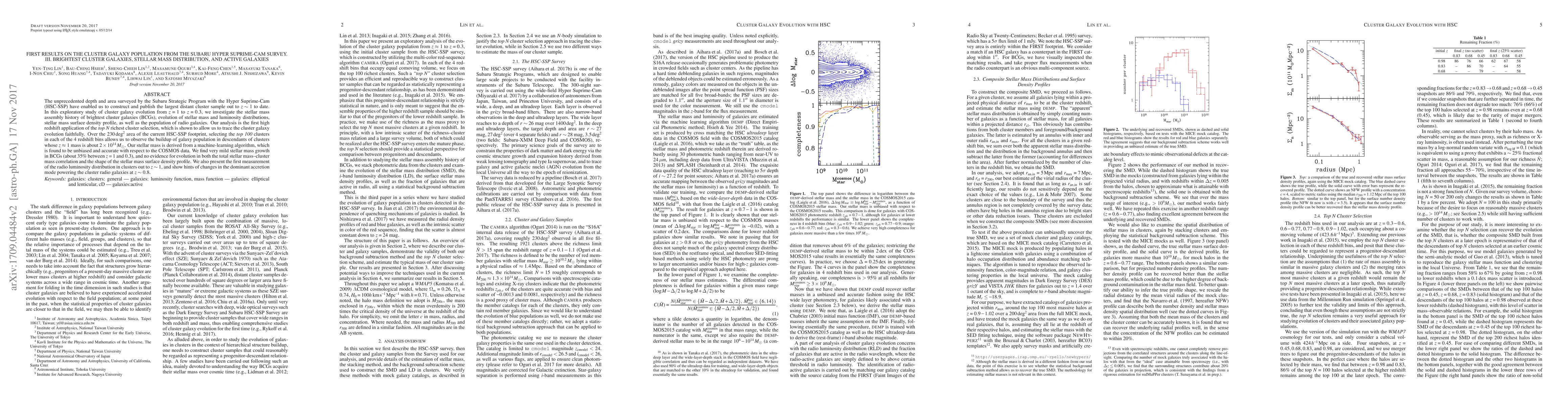 This paper uses the Subaru Hyper Suprime-Cam survey to study the evolution of cluster galaxies, focusing on brightest cluster galaxies' stellar mass, and the population of radio galaxies. The analysis reveals mild stellar mass growth in BCGs and no significant evolution in the total stellar mass-cluster mass correlation or the shape of the stellar mass surface density profile.