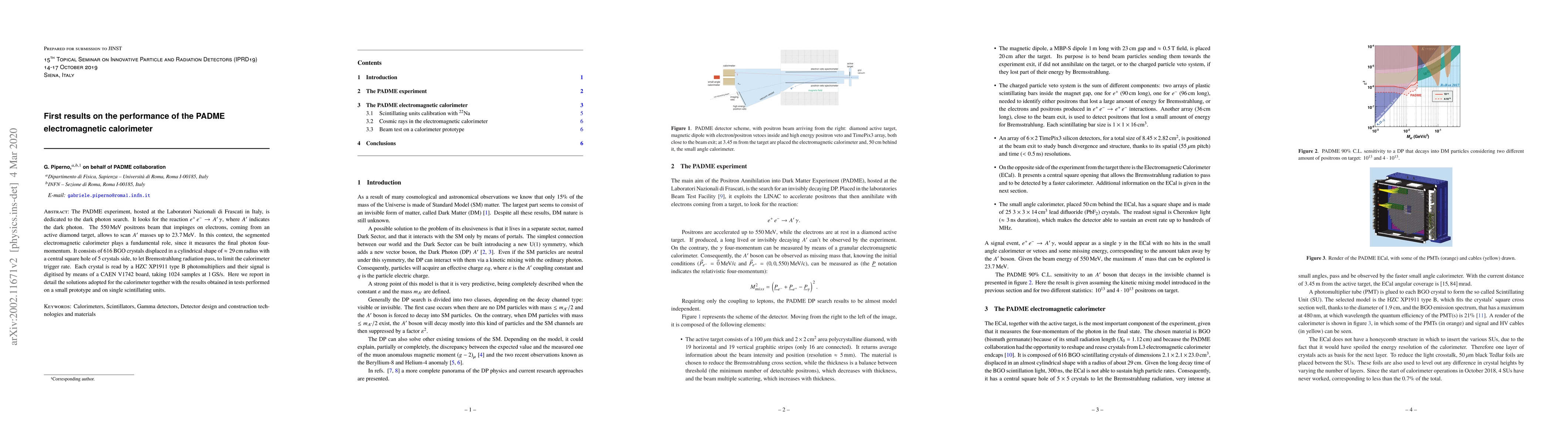 The PADME experiment aims to detect dark photons through the reaction $e^{+}\,e^{-}\rightarrow A'\,\gamma$ using a $550\,\text{MeV}$ positron beam. The electromagnetic calorimeter, composed of 616 BGO crystals, measures final photon four-momentum and has been tested on prototypes and single units, showing promising results.