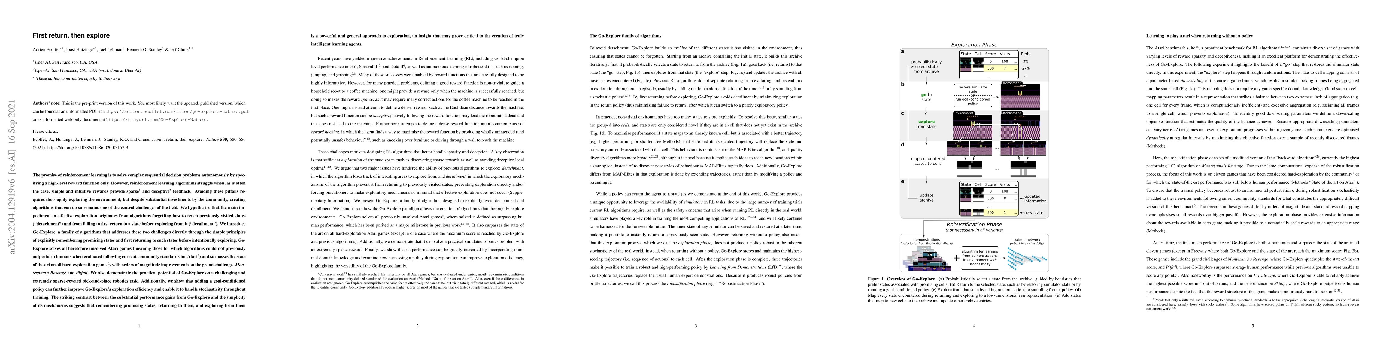 The paper introduces Go-Explore, a reinforcement learning algorithm that tackles exploration challenges by remembering promising states and returning to them before exploring, achieving state-of-the-art results in Atari games and sparse-reward robotics tasks. The approach demonstrates significant improvements in environments with deceptive sparse rewards, suggesting effective exploration strategies are key to intelligent learning.